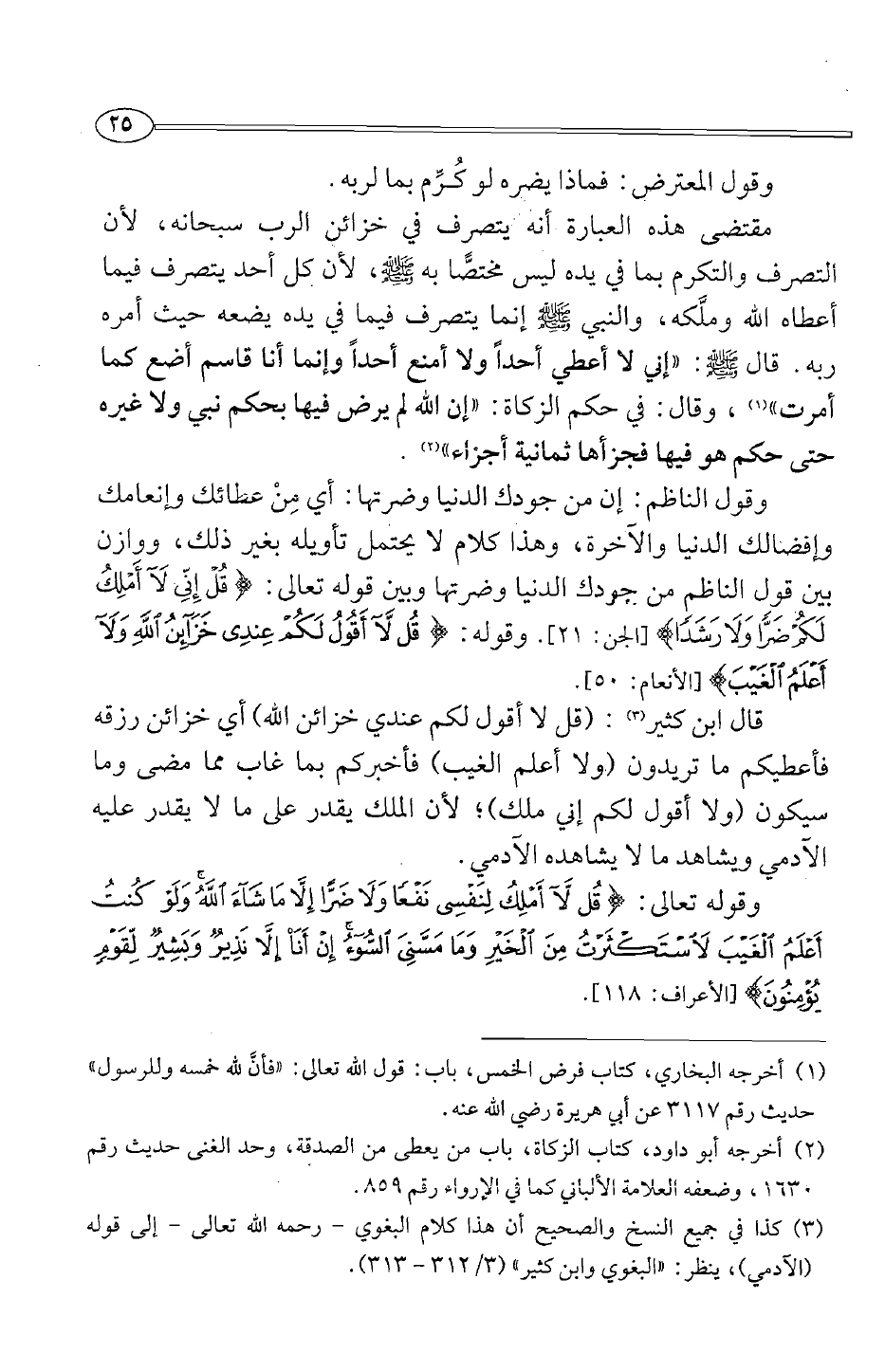 وقول الناظم: إن من جودك الدنيا وضرتها: أي من عطائك وإنعامك وإفضالك الدنيا والآخرة، وهذا كلام لا يحتمل تأويله بغير ذلك، ووازن بين قول الناظم من جودك الدنيا وضرتها وبين قوله تعالى: {قُلْ إِنِّي لَا أَمْلِكُ لَكُمْ ضَرًّا وَلَا رَشَدًا} [الجن:21] . وقوله: {قُلْ لَا أَقُولُ لَكُمْ عِندِي خَزَائِنُ اللَّهِ وَلَا أَعْلَمُ الْغَيْبَ} [الأنعام: 50] .