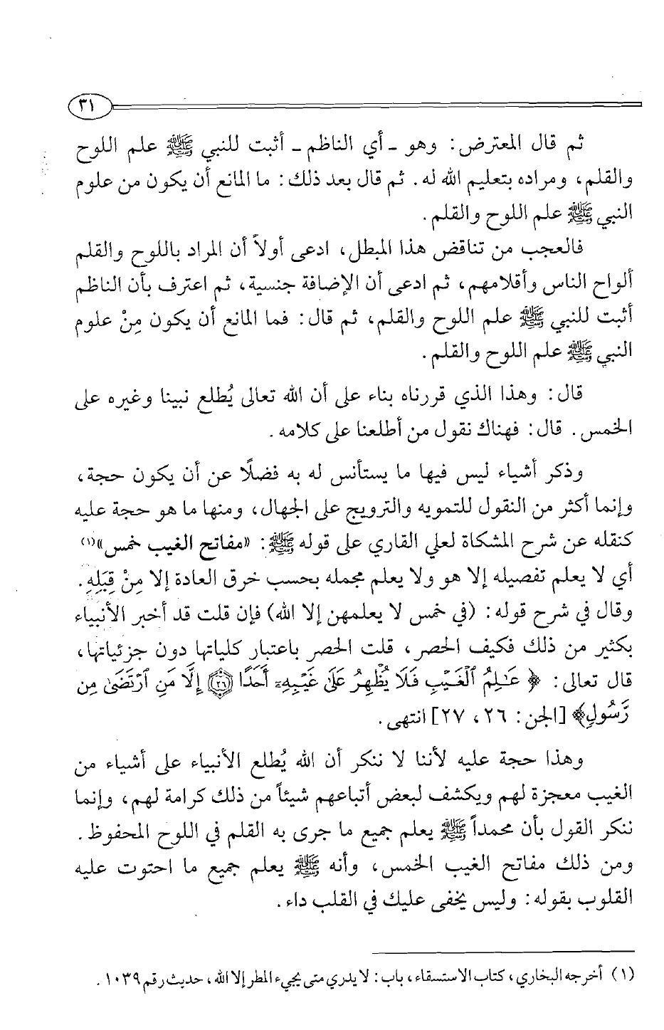 وذكر أشياء ليس فيها ما يستأنس له به فضلا عن أن يكون حجة، وإنما أكثر من النقول للتمويه والترويج على الجهال، ومنها ما هو حجة عليه كنقله عن شرح المشكاة لعلي القاري على قوله صلى الله عليه وسلم: "مفاتح الغيب خمس" 1 أي لا يعلم تفصيله إلا هو ولا يعلم مجمله بحسب خرق العادة إلا من قبله.