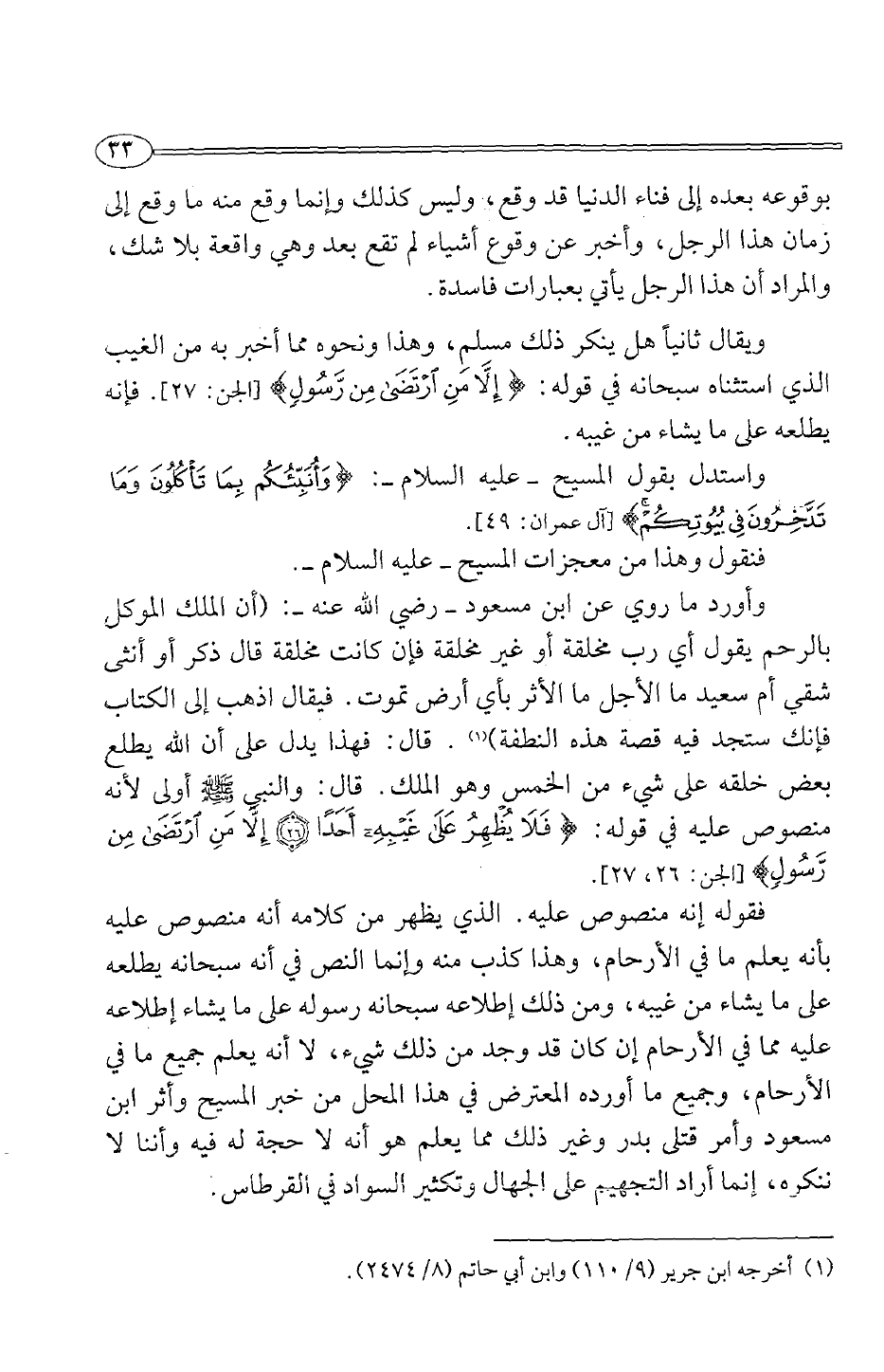 فقوله إنه منصوص عليه. الذي يظهر من كلامه أنه منصوص عليه بأنه يعلم ما في الأرحام، وهذا كذب منه وإنما النص في أنه سبحانه يطلعه على ما يشاء من غيبه، ومن ذلك إطلاعه سبحانه رسوله على ما يشاء إطلاعه عليه مما في الأرحام إن كان قد وجد من ذلك شيء، لا أنه يعلم جميع ما في الأرحام، وجميع ما أورده المعترض في هذا المحل من خبر المسيح وأثر ابن مسعود وأمر قتلى بدر وغير ذلك مما يعلم هو أنه لا حجة له فيه وأننا لا ننكره، إنما أراد التجهيم على الجهال وتكثير السواد في القرطاس.