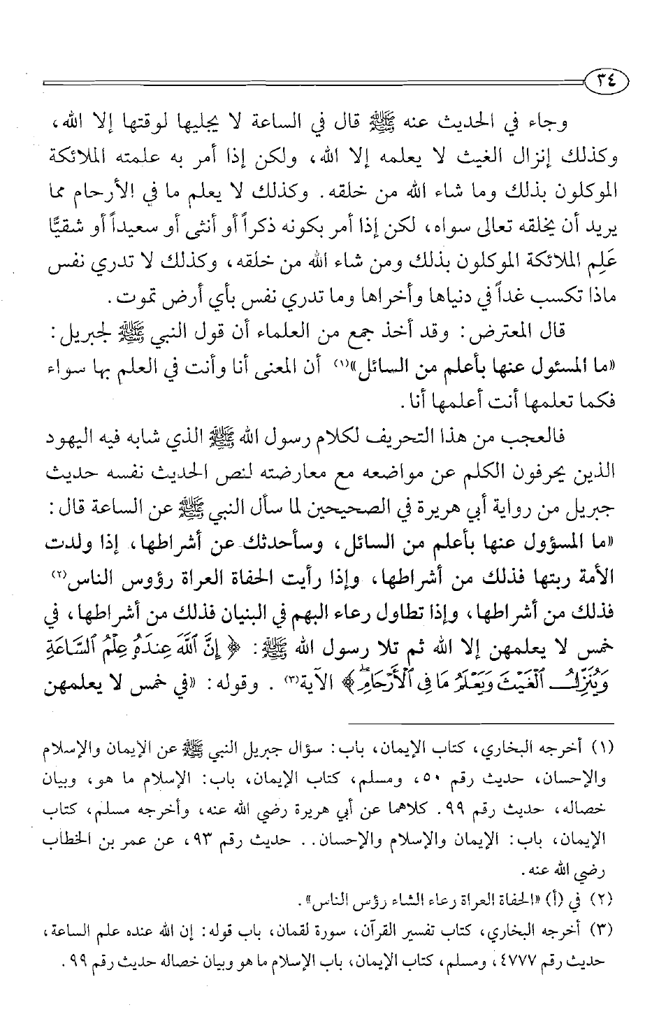 3 أخرجه البخاري، كتاب تفسير القرآن، سورة لقمان، باب قوله: إن الله عنده علم الساعة، حديث رقم 4777، ومسلم، كتاب الإيمان، باب الإسلام ما هو وبيان خصاله حديث رقم 99.