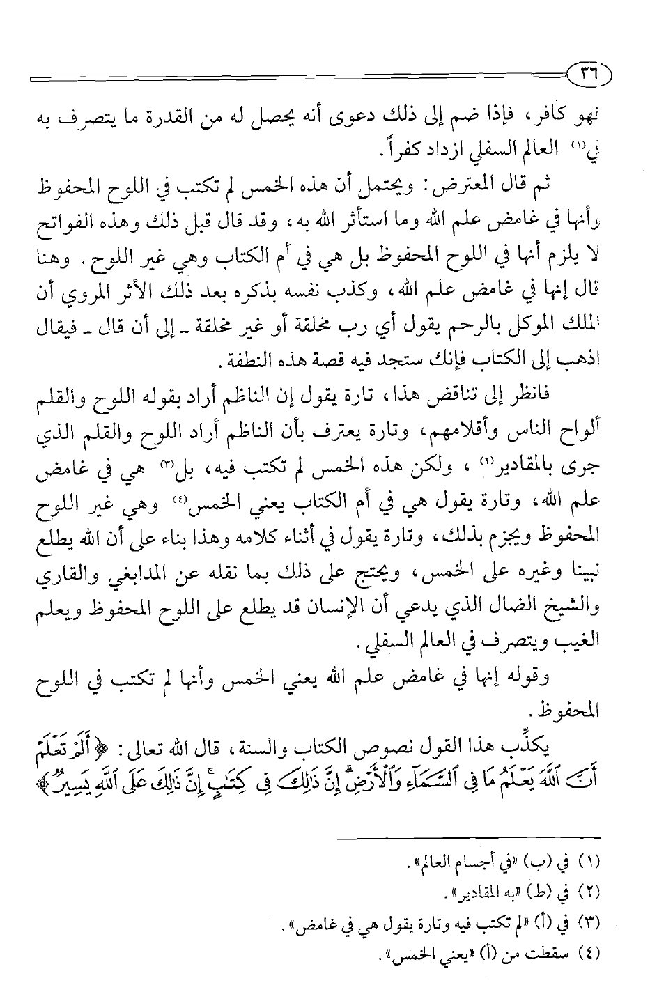 ثم قال المعترض: ويحتمل أن هذه الخمس لم تكتب في اللوح المحفوظ وأنها في غامض علم الله وما استأثر الله به، وقد قال قبل ذلك وهذه الفواتح لا يلزم أنها في اللوح المحفوظ بل هي في أم الكتاب وهي غير اللوح. وهنا قال إنها في غامض علم الله، وكذب نفسه بذكره بعد ذلك الأثر المروي أن الملك الموكل بالرحم يقول أي رب مخلقة وغير مخلقة -إلى أن قال- فيقال اذهب إلى الكتاب فإنك ستجد فيه قصة هذه النطفة.