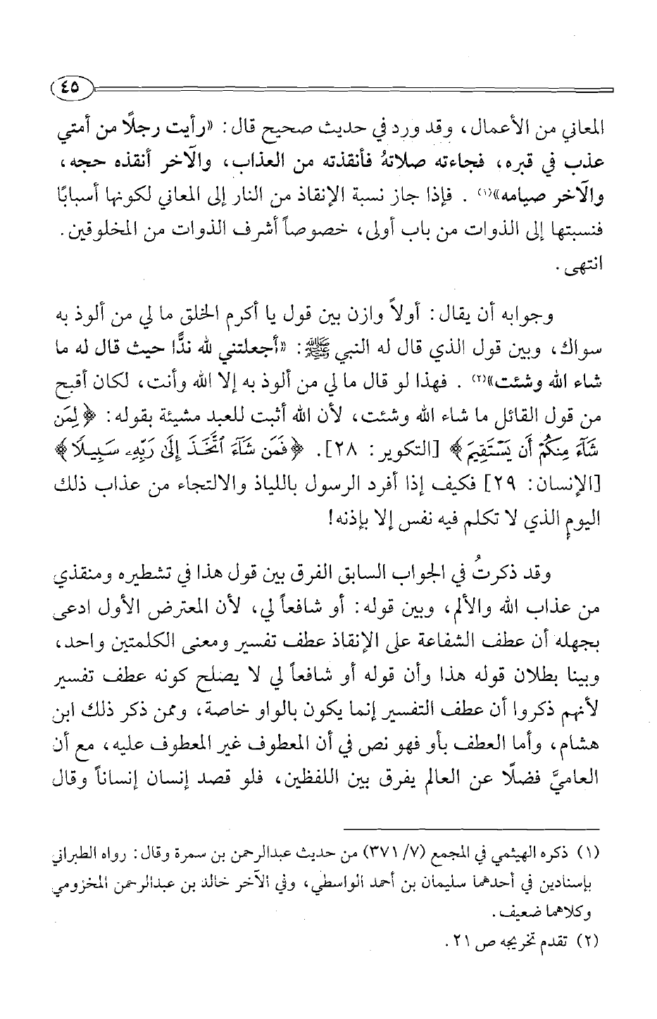 المعاني من الأعمال، وقد ورد في حديث صحيح قال: "رأيت رجلا من أمتي عذب في قبره، فجاءته صلاته فأنقذته من العذاب، والآخر أنقذه حجه، والآخر صيامه" 1. فإذا جاز نسبة الإنقاذ من النار إلى المعاني لكونه أسبابا فنسبتها إلى الذوات من باب أولى، خصوصا أشرف الذوات من المخلوقين. انتهى.