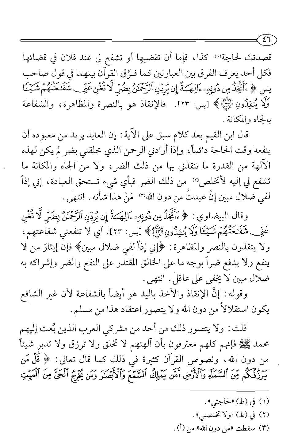 قال ابن القيم بعد كلام سبق على الآية: إن العابد يريد من معبوده أن ينفعه وقت الحاجة دائما، وإن أرادني الرحمن الذي خلقني بضر لم يكن لهذه الآلهة من القدرة ما تنقذني بها من ذلك الضر، ولا من الجاه والمكانة ما تشفع لي إليه لأتخلص 2 من ذلك الضر فبأي شيء تستحق العبادة، إني إذا لفي ضلال مبين إن عبدت من دون الله 3 من هذا شأنه. انتهى.