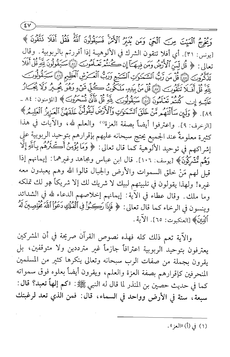 والآية تعم ذلك كله فهذه نصوص القرآن صريحة في أن المشركين يعترفون بتوحيد الربوبية اعترافا جازما غير مترددين ولا متوقفين، بل يقرون بجملة من صفات الرب سبحانه وتعالى ينكرها كثير من المسلمين المنحرفين كإقرارهم بصفة العزة والعلم، ويقرون أيضا بعلوه فوق سمواته كما في حديث حصين بن المنذر لما قال له النبي صلى الله عليه وسلم: " كم إلها تعبد؟ قال: سبعة، ستة في الأرض وواحد في السماء، قال: فمن الذي تعد لرغبتك