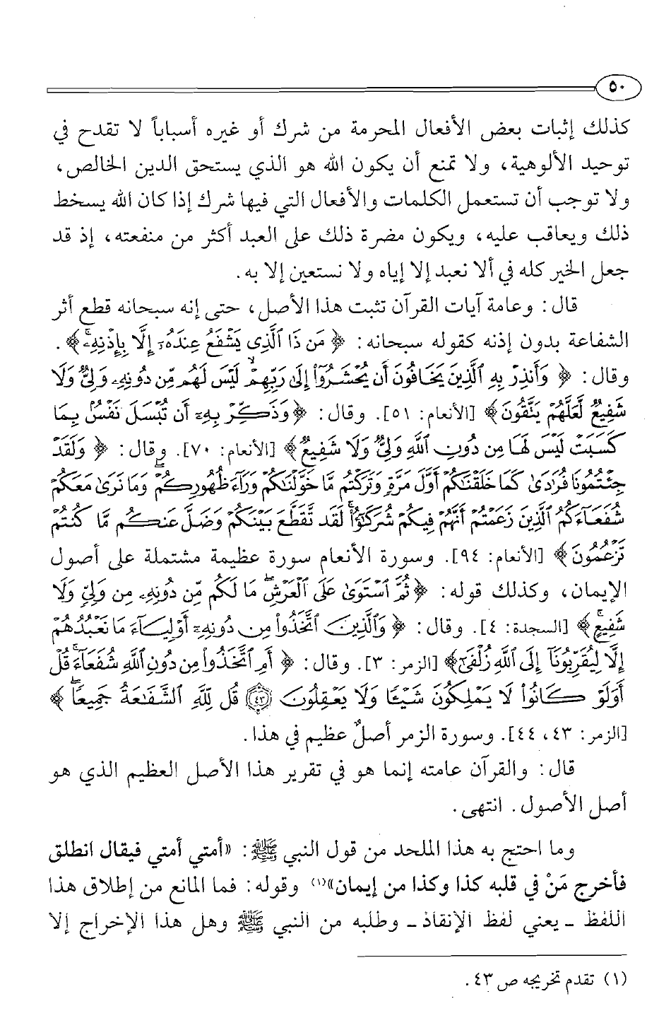 قال: وعامة آيات القرآن تثبت هذا الأصل، حتى إنه سبحانه قطع أثر الشفاعة بدون إذنه كقوله سبحانه: {مَنْ ذَا الَّذِي يَشْفَعُ عِنْدَهُ إِلَّا بِإِذْنِهِ} . وقال: {وَأَنذِرْ بِهِ الَّذِينَ يَخَافُونَ أَنْ يُحْشَرُوا إِلَى رَبِّهِمْ لَيْسَ لَهُمْ مِنْ دُونِهِ وَلِيٌّ وَلَا شَفِيعٌ لَعَلَّهُمْ يَتَّقُونَ} [الأنعام:51] . وقال: {وذكر به أن تبسل نفس بما كسبت ليس لها من دون الله ولي ولا شفيع} [الأنعام:70] . وقال: {وَلَقَدْ جِئْتُمُونَا فُرَادَى كَمَا خَلَقْنَاكُمْ أَوَّلَ مَرَّةٍ وَتَرَكْتُمْ مَا خَوَّلْنَاكُمْ وَرَاءَ ظُهُورِكُمْ وَمَا نَرَى مَعَكُمْ شُفَعَاءَكُمْ الَّذِينَ زَعَمْتُمْ أَنَّهُمْ فِيكُمْ شُرَكَاءُ لَقَدْ تَقَطَّعَ بَيْنَكُمْ وَضَلَّ عَنكُمْ مَا كُنتُمْ تَزْعُمُونَ} [الأنعام:94] . وسورة الأنعام سورة عظيمة مشتملة على أصول الإيمان، وكذلك قوله: {ثُمَّ اسْتَوَى عَلَى الْعَرْشِ مَا لَكُمْ مِنْ دُونِهِ مِن وَلِيٍّ وَلَا شَفِيعٍ} [السجدة:4] . وقال: {وَالَّذِينَ اتَّخَذُوا مِنْ دُونِهِ أَوْلِيَاءَ مَا نَعْبُدُهُمْ إِلَّا لِيُقَرِّبُونَا إِلَى اللَّهِ زُلْفَى} [الزمر:3] . وقال: {أَمْ اتَّخَذُوا مِنْ دُونِ اللَّهِ شُفَعَاءَ قُلْ أَوَلَوْ كَانُوا لَا يَمْلِكُونَ شَيْئًا وَلَا يَعْقِلُونَ * قُلْ لِلَّهِ الشَّفَاعَةُ جَمِيعًا} [الزمر:43،44] . وسورة الزمر أصل عظيم في هذا.