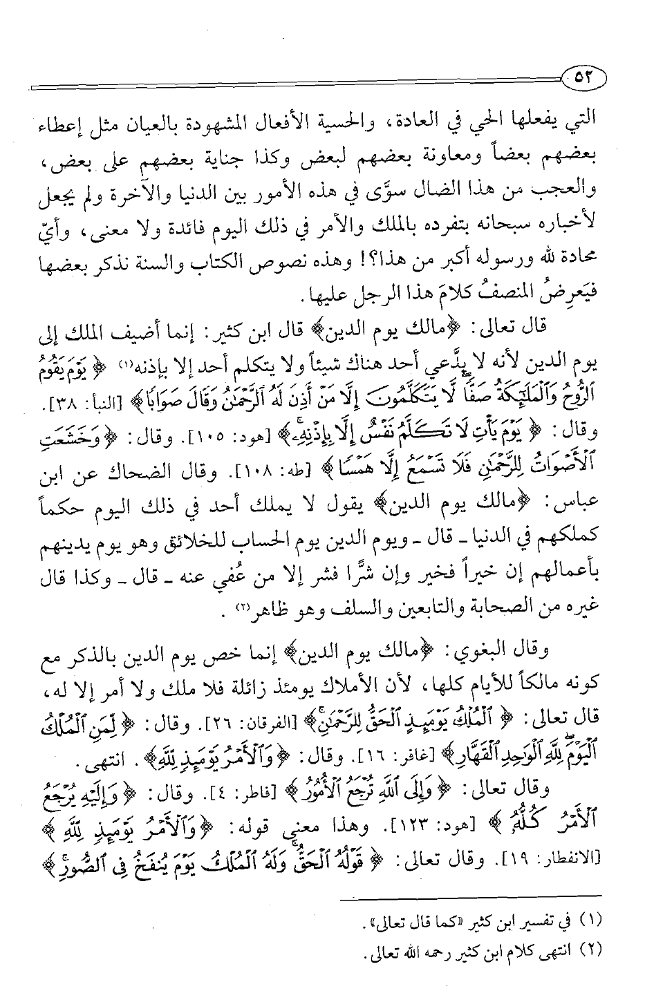 قال تعالى: {مَالِكِ يَوْمِ الدِّينِ} قال ابن كثير: إنما أضيف الملك إلى يوم الدين لأنه لا يدعي أحد هناك شيئا ولا يتكلم أحد إلا بإذنه 1 {يَوْمَ يَقُومُ الرُّوحُ وَالْمَلَائِكَةُ صَفًّا لَا يَتَكَلَّمُونَ إِلَّا مَنْ أَذِنَ لَهُ الرَّحْمَانُ وَقَالَ صَوَابًا} [النبأ:38] . وقال: {يَوْمَ يَأْتِ لَا تَكَلَّمُ نَفْسٌ إِلَّا بِإِذْنِهِ} [هود:105] . وقال: {وَخَشَعَتْ الْأَصْوَاتُ لِلرَّحْمَانِ فَلَا تَسْمَعُ إِلَّا هَمْسًا} [طه:108] . وقال الضحاك عن ابن عباس: {مَالِكِ يَوْمِ الدِّينِ} يقول لا يملك أحد في ذلك اليوم حكما كملكهم في الدنيا –قال- ويوم الدين يوم الحساب للخلائق وهو يوم يدينهم بأعمالهم إن خيرا فخير وإن شرا فشر إلا من عفي عنه –قال- وكذا قال غيره من الصحابة والتابعين والسلف وهو ظاهر 2.