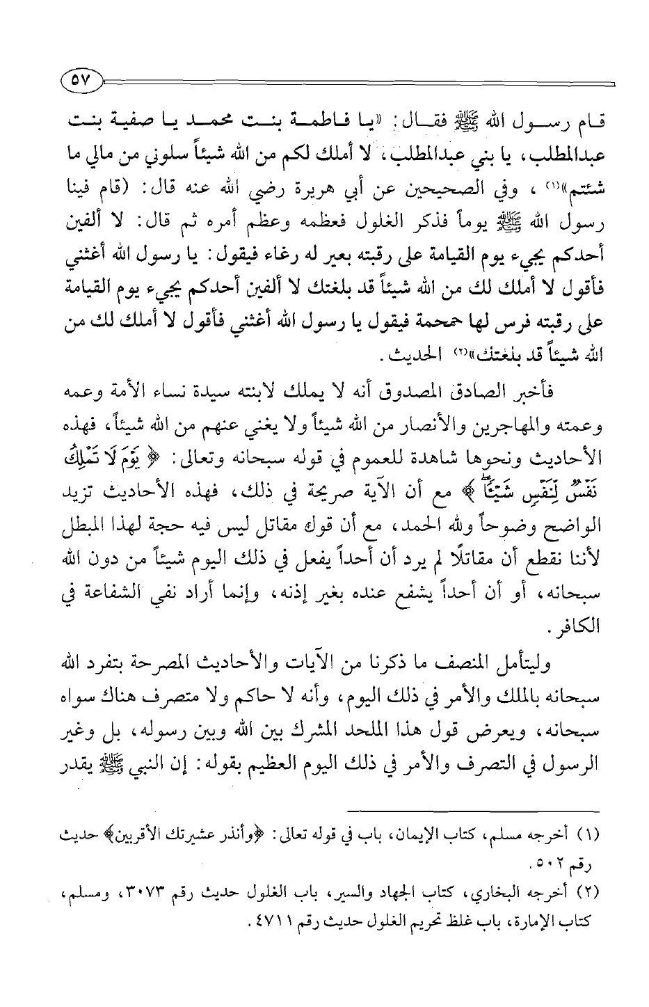 قام رسول الله صلى الله عليه وسلم فقال: "يا فاطمة بنت محمد يا صفية بنت عبد المطلب، يا بني عبد المطلب، لا أملك لكم من الله شيئا سلوني من مالي ما شئت م"1، وفي الصحيحين عن أبي هريرة رضي الله عنه قال: "قام فينا رسول الله صلى الله عليه وسلم يوما فذكر الغلول فعظمه وعظم أمره ثم قال: لا ألفين أحدكم يجيء يوم القيامة على رقبته بعير له رغاء فيقول: يا رسول الله أغثني فأقول لا أملك لك من الله شيئا قد بلغتك لا ألفين أحدكم يجيء يوم القيامة على رقبته فرس لها حمحمة فيقول يا رسول الله أغثني فأقول لا أملك لك من الله شيئا قد بلغتك" 2 الحديث.
