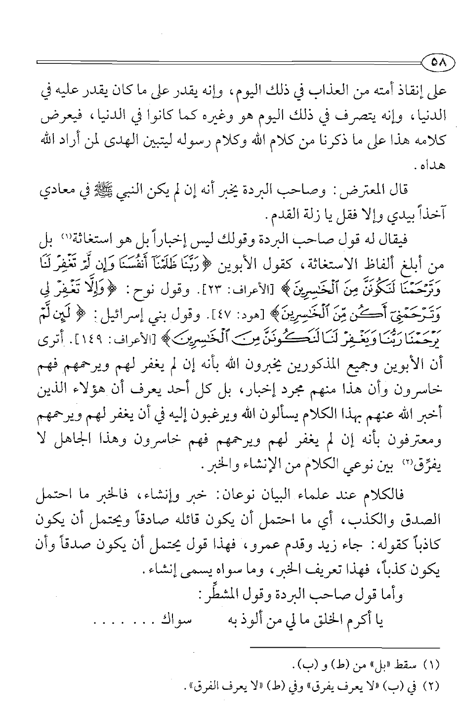 فيقال له قول صاحب البردة وقولك ليس إخبارا بل هو استغاثة 1 بل من أبلغ ألفاظ الاستغاثة، كقول الأبوين {رَبَّنَا ظَلَمْنَا أَنفُسَنَا وَإِنْ لَمْ تَغْفِرْ لَنَا وَتَرْحَمْنَا لَنَكُونَنَّ مِنْ الْخَاسِرِينَ} [الأعراف:23] . وقول نوح: {وَإِلَّا تَغْفِرْ لِي وَتَرْحَمْنِي أَكُنْ مِنْ الْخَاسِرِينَ} [هود:47] . وقول بني إسرائيل: {لَئِنْ لَمْ يَرْحَمْنَا رَبُّنَا وَيَغْفِرْ لَنَا لَنَكُونَنَّ مِنْ الْخَاسِرِينَ} [الأعراف:149] . أترى أن الأبوين وجميع المذكورين يخبرون الله بأنه إن لم يغفر لهم ويرحمهم فهم خاسرون وأن هذا منهم مجرد إخبار، بل كل أحد يعرف أن هؤلاء الذين أخبر الله عنهم بهذا الكلام يسألون الله ويرغبون إليه في أن يغفر لهم ويرحمهم ومعترفون بأنه إن لم يغفر لهم ويرحمهم فهم خاسرون وهذا الجاهل لا يفرق 2 بين نوعي الكلام من الإنشاء والخبر.