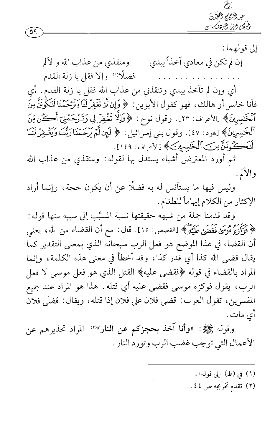 وقد قدمنا جملة من شبهه حقيقتها نسبة المسبب إلى سببه منها قوله: {فَوَكَزَهُ مُوسَى فَقَضَى عَلَيْهِ} [القصص:15] . قال: مع أن القضاء من الله، يعني أن القضاء في هذا الموضع هو فعل الرب سبحانه الذي بمعنى التقدير كما يقال قضى الله كذا أي قدر كذا، وقد أخطأ في معنى هذه الكلمة، وإنما المراد بالقضاء في قوله {فَقَضَى عَلَيْهِ} القتل الذي هو فعل موسى لا فعل الرب، يقول فوكزه موسى فقضى عليه أي قتله. هذا هو المراد عند جميع المفسرين، تقول العرب: قضى فلان على فلان إذا قتله، ويقال قضى فلان أي مات.