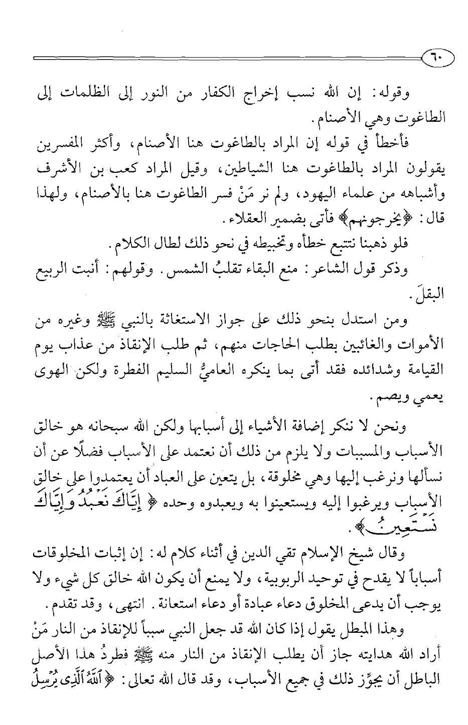 وقال شيخ الإسلام تقي الدين في أثناء كلام له: إن إثبات المخلوقات أسبابا لا يقدح في توحيد الربوبية، ولا يمنع أن يكون الله خالق كل شيء ولا يوجب أن يدعى المخلوق دعاء عبادة أو دعاء استعانة. انتهى، وقد تقدم.