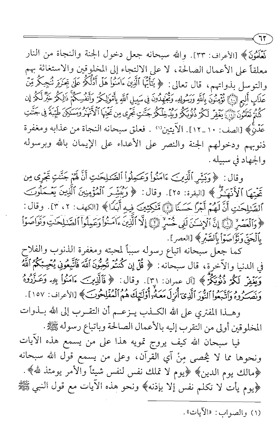 تَعْلَمُونَ} [الأعراف:33] . والله سبحانه جعل دخول الجنة والنجاة من النار معلقا على الأعمال الصالحة، لا على الالتجاء إلى المخلوقين والاستغاثة بهم والتوسل بذواتهم، قال تعالى: {يَاأَيُّهَا الَّذِينَ آَمَنُوا هَلْ أَدُلُّكُمْ عَلَى تِجَارَةٍ تُنجِيكُمْ مِنْ عَذَابٍ أَلِيمٍ * تُؤْمِنُونَ بِاللَّهِ وَرَسُولِهِ وَتُجَاهِدُونَ فِي سَبِيلِ اللَّهِ بِأَمْوَالِكُمْ وَأَنفُسِكُمْ ذَلِكُمْ خَيْرٌ لَكُمْ إِنْ كُنتُمْ تَعْلَمُونَ * يَغْفِرْ لَكُمْ ذُنُوبَكُمْ وَيُدْخِلْكُمْ جَنَّاتٍ تَجْرِي مِنْ تَحْتِهَا الْأَنْهَارُ وَمَسَاكِنَ طَيِّبَةً فِي جَنَّاتِ عَدْنٍ} [الصف:10-12] الآيتين 1.
