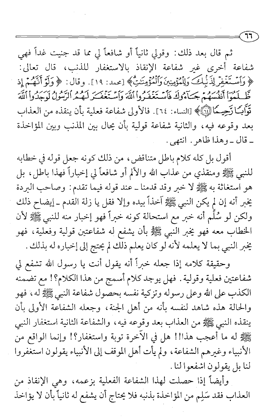 أقول بل كله كلام باطل متناقض، من ذلك كونه جعل قوله في خطابه للنبي صلى الله عليه وسلم ومنقذي من عذاب الله والألم أو شافعا لي إخبارا فهذا باطل، بل هو استغاثة به صلى الله عليه وسلم لا خبر وقد قدمنا -عند قوله فيما تقدم: وصاحب البردة يخبر أنه إن لم يكن النبي صلى الله عليه وسلم آخذا بيده وإلا فقل يا زلة القدم- إيضاح ذلك ولكن لو سلم أنه خبر مع استحالة كونه خبرا فهو إخبار منه للنبي صلى الله عليه وسلم لأن الخطاب معه فهو يخبر النبي صلى الله عليه وسلم بأن يشفع له شفاعتين قولية وفعلية،