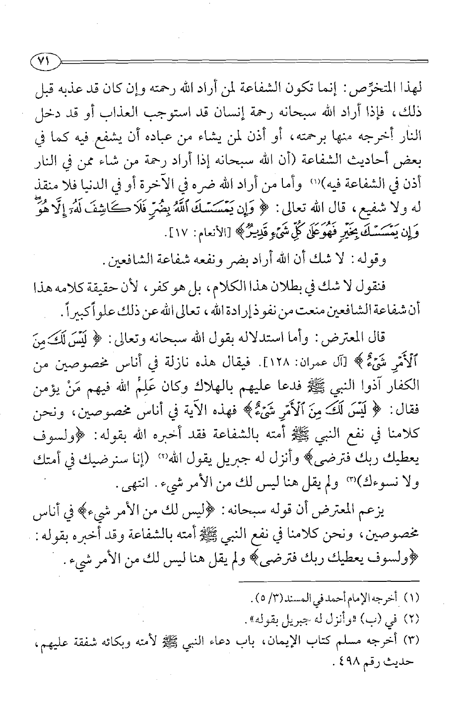 قال المعترض: وأما استدلاله بقول الله سبحانه وتعالى: {لَيْسَ لَكَ مِنْ الْأَمْرِ شَيْءٌ} [آل عمران 128] . فيقال هذه نازلة في أناس مخصوصين من الكفار آذوا النبي صلى الله عليه وسلم فدعا عليهم بالهلاك وكان علم الله فيهم من يؤمن فقال: {لَيْسَ لَكَ مِنْ الْأَمْرِ شَيْءٌ} فهذه الآية في أناس مخصوصين، ونحن كلامنا في نفع النبي صلى الله عليه وسلم أمته بالشفاعة فقد أخبره الله بقوله: {وَلَسَوْفَ يُعْطِيكَ رَبُّكَ فَتَرْضَى} وأنزل له جبريل يقول الله2 {نرضيك في أمتك ولا نسوءك} 3 ولم يقل هنا ليس لك من الأمر شيء. انتهى.