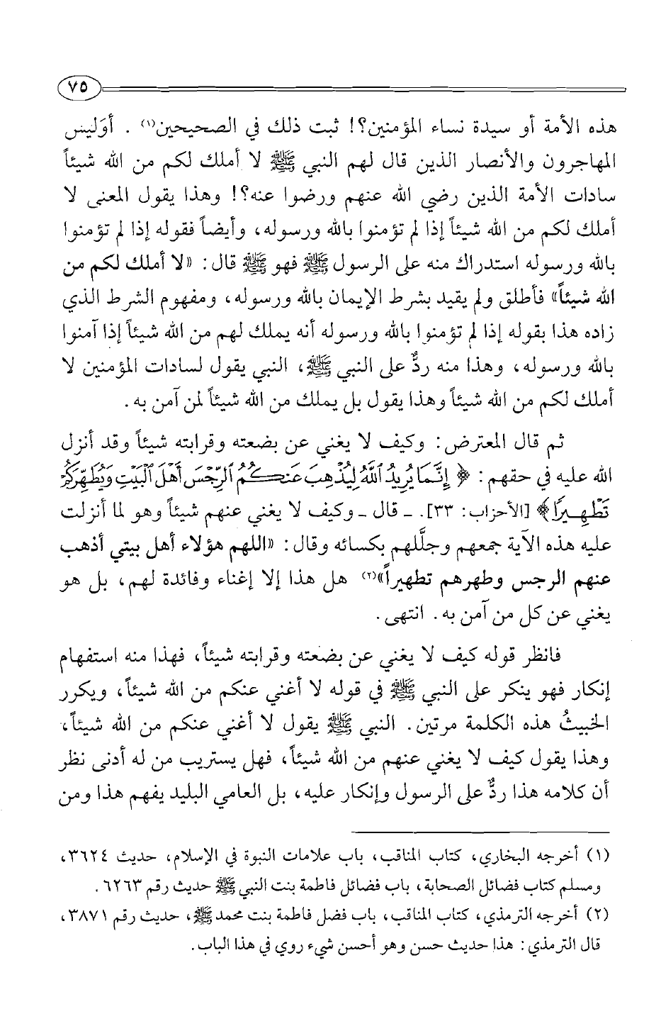 هذه الأمة أو سيدة نساء المؤمنين؟! ثبت ذلك في الصحيحين1.أو ليس المهاجرون والأنصار الذين قال لهم النبي صلى الله عليه وسلم لا أملك لكم من الله شيئا سادات الأمة الذين رضي الله عنهم ورضوا عنه؟! وهذا يقول المعنى لا أملك لكم من الله شيئا إذا لم تؤمنوا بالله ورسوله، وأيضا فقوله إذا لم تؤمنوا بالله ورسوله استدراك منه على الرسول صلى الله عليه وسلم فهو صلى الله عليه وسلم قال: "لا أملك لكم من الله شيئا" فأطلق ولم يقيد بشرط الإيمان بالله ورسوله، ومفهوم الشرط الذي زاده هذا بقوله إذا لم تؤمنوا بالله ورسوله أنه يملك لهم من الله شيئا إذا آمنوا بالله ورسوله، وهذا منه رد على النبي صلى الله عليه وسلم، النبي يقول لسادات المؤمنين لا أملك لكم من الله شيئا وهذا يقول بل يملك من الله شيئا لمن آمن به.