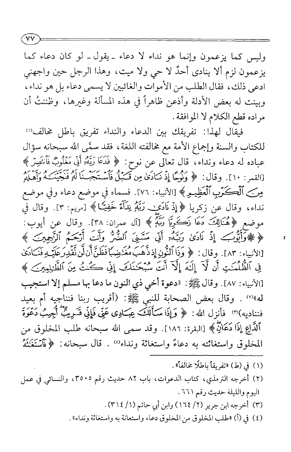 فيقال لهذا: تفريقك بين الدعاء والنداء تفريق باطل مخالف1 للكتاب والسنة وإجماع الأمة مع مخالفته اللغة، فقد سمى الله سبحانه سؤال عباده له دعاء ونداء، قال تعالى عن