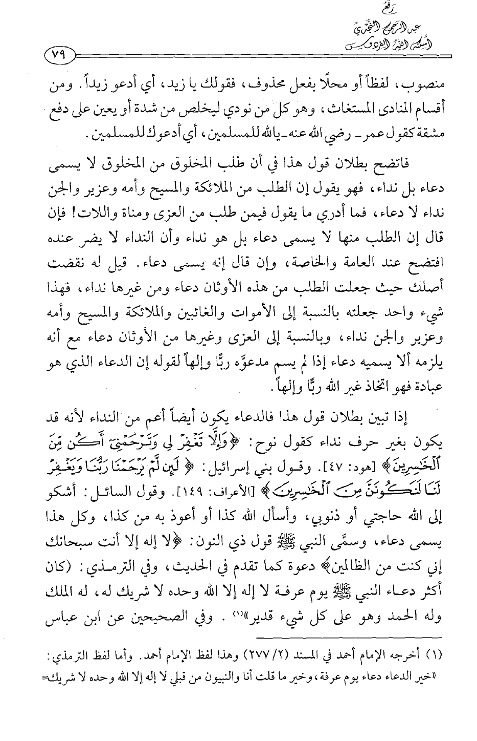 إذا تبين بطلان قول هذا فالدعاء يكون أيضا أعم من النداء لأنه قد يكون بغير حرف نداء كقول نوح {وَإِلَّا تَغْفِرْ لِي وَتَرْحَمْنِي أَكُنْ مِنْ الْخَاسِرِينَ} [هود:47] وقول بني اسرائيل: {لَئِنْ لَمْ يَرْحَمْنَا رَبُّنَا وَيَغْفِرْ لَنَا لَنَكُونَنَّ مِنْ الْخَاسِرِينَ} [الأعراف:149] . وقول السائل أشكوا إلى الله حاجتي أو ذنوبي، وأسأل الله كذا أو أعوذ به من كذا، وكل هذا يسمى دعاء، وسمى النبي صلى الله عليه وسلم قول ذي النون: {أَنْ لَا إِلَهَ إِلَّا أَنْتَ سُبْحَانَكَ إِنِّي كُنتُ مِنْ الظَّالِمِينَ} دعوة كما تقدم في الحديث، وفي الترمذي: {كان أكثر دعاء النبي صلى الله عليه وسلم يوم عرفة لاإله إلا الله وحده لا شريك له، له الملك وله الحمد وهو على كل شيء قدير} 1. وفي الصحيحين عن ابن عباس