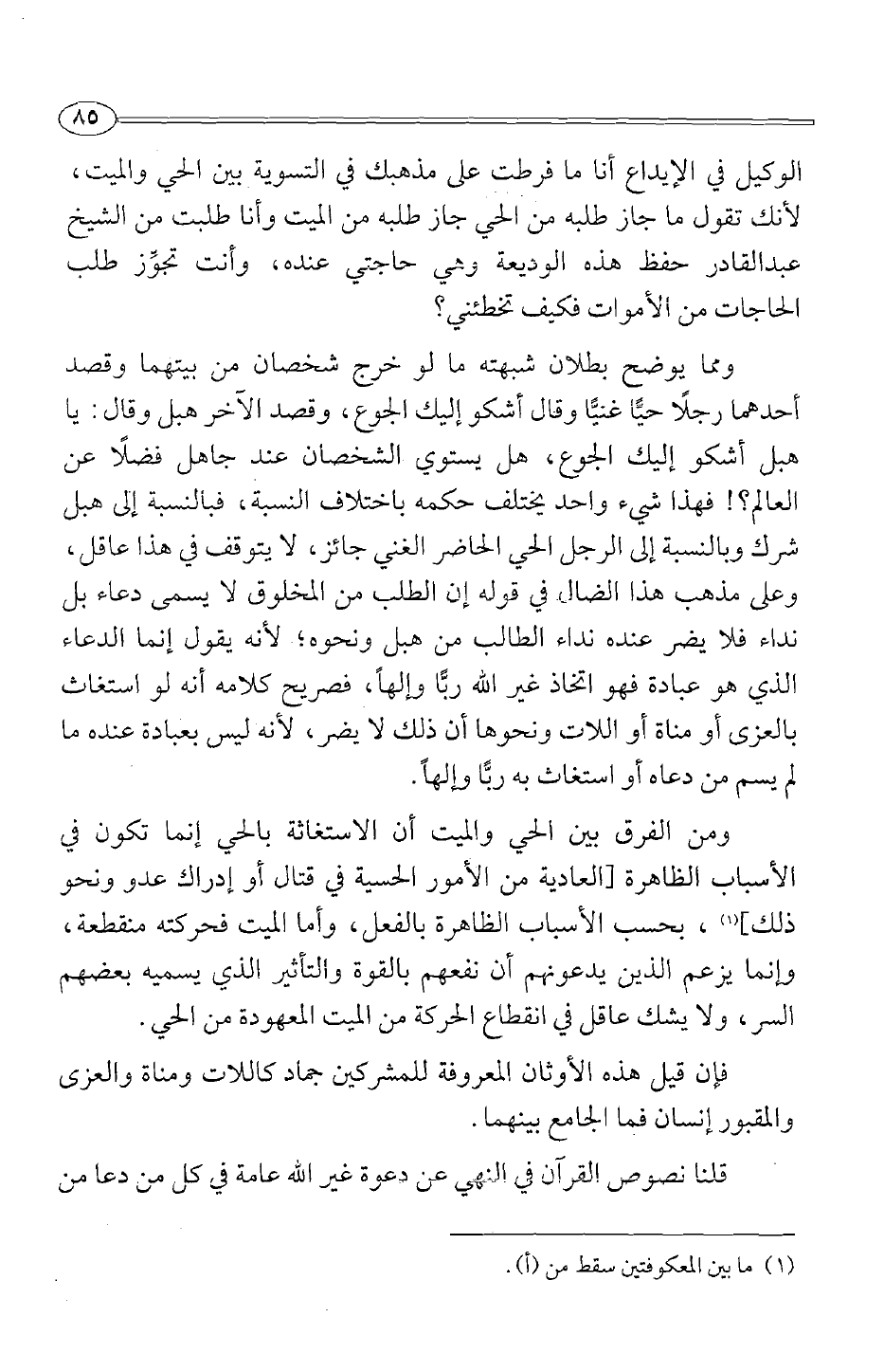 ومن الفرق بين الحي والميت أن الاستغاثة بالحي إنما تكون في الأسباب الظاهرة [العادية من الأمور الحسية في قتال أو ادراك عدو ونحو ذلك] 1، بحسب الأسباب الظاهرة بالفعل، وأما الميت فحركته منقطعة، وإنما يزعم الذين يدعونهم أن نفعهم بالقوة والتأثير الذي يسميه بعضهم السر، ولا يشك عاقل في انقطاع الحركة من الميت المعهودة من الحي.