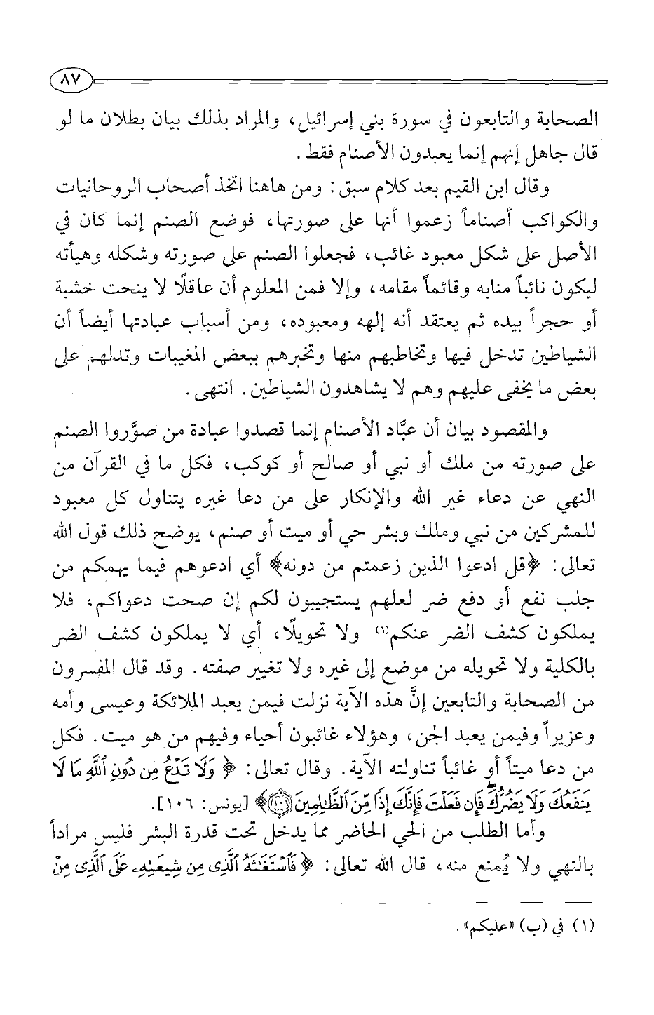 والمقصود بيان أن عباد الأصنام إنما قصدوا عبادة من صوروا الصنم على صورته من ملك أو نبي أو صالح أو كوكب، فكل ما في القرآن من النهي عن دعاء غير الله والإنكار على من دعا غيره يتناول كل معبود للمشركين من نبي وملك وبشر حي أو ميت أو صنم، يوضح ذلك قول الله تعالى: {قُلْ ادْعُوا الَّذِينَ زَعَمْتُمْ مِنْ دُونِهِ} أي ادعوهم فيما يهمكم من جلب نفع أو دفع ضر لعلهم يستجيبون لكم إن صحت دعواكم، فلا يملكون كشف الضر عنكم1 ولاتحويلا، أي لا يملكون كشف الضر بالكلية ولا تحويله من موضع إلى غيره ولا تغيير صفته. وقد قال المفسرون من الصحابة والتابعين إن هذه الآية نزلت فيمن يعبد الملائكة وعيسى وأمه وعزيرا وفيمن يعبد الجن، وهؤلاء غائبون أحياء وفيهم من هو ميت. فكل من دعا ميتا أو غائبا تناولته الآية. وقال تعالى: {وَلَا تَدْعُ مِنْ دُونِ اللَّهِ مَا لَا يَنْفَعُكَ وَلَا يَضُرُّكَ فَإِنْ فَعَلْتَ فَإِنَّكَ إِذًا مِنْ الظَّالِمِينَ} [يونس:106] .