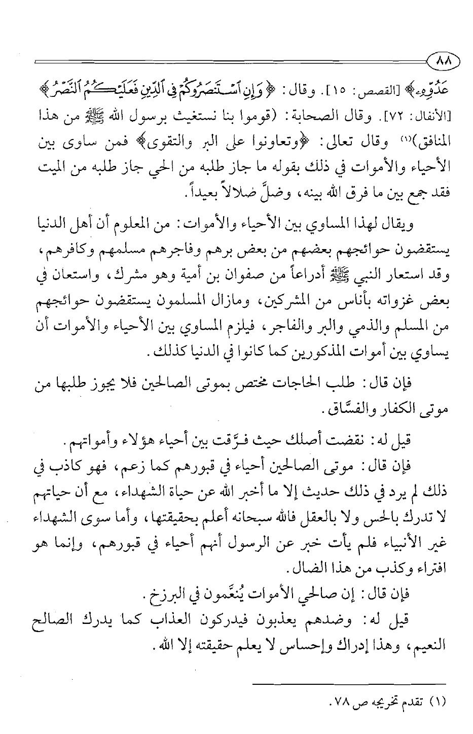 ويقال لهذا المساوي بين الأحياء والأموات: من المعلوم أن أهل الدنيا يستقضون حوائجهم بعضهم من بعض برهم وفاجرهم مسلمهم وكافرهم، وقد استعار النبي صلى الله عليه وسلم أدراعا من صفوان بن أمية وهو مشرك، واستعان في بعض غزواته بأناس من المشركين، وما زال المسلمون يستقضون حوائجهم من المسلم والذمي والبر والفاجر، فيلزم المساوى بين الأحياء والأموات أن يساوي بين أموات المذكورين كما كانوا في الدنيا كذلك.