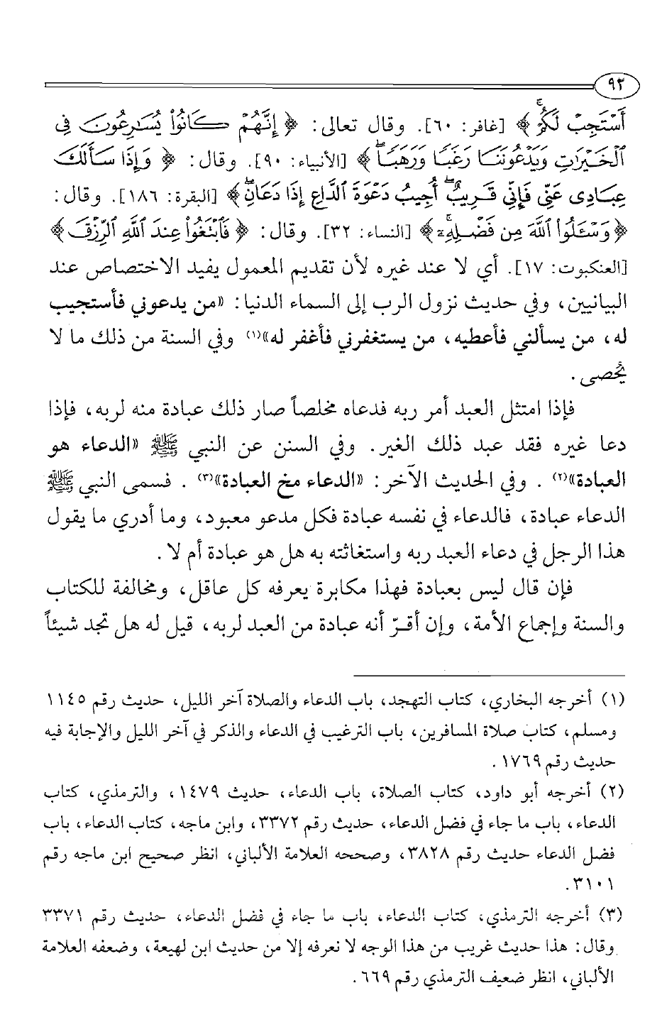 فإذا امتثل العبد أمر ربه فدعاه مخلصا صار ذلك عبادة منه لربه، فإذا دعا غيره فقد عبد ذلك الغير. وفي السنن عن النبي صلى الله عليه وسلم "الدعاء هو العبادة"2. وفي الحديث الآخر: "الدعاء مخ العبادة" 3. فسمى النبي صلى الله عليه وسلم الدعاء عبادة، فالدعاء في نفسه عبادة فكل مدعو معبود، وما أدري ما يقول هذا الرجل في دعاء العبد ربه واستغاثته به هل هو عبادة أم لا.