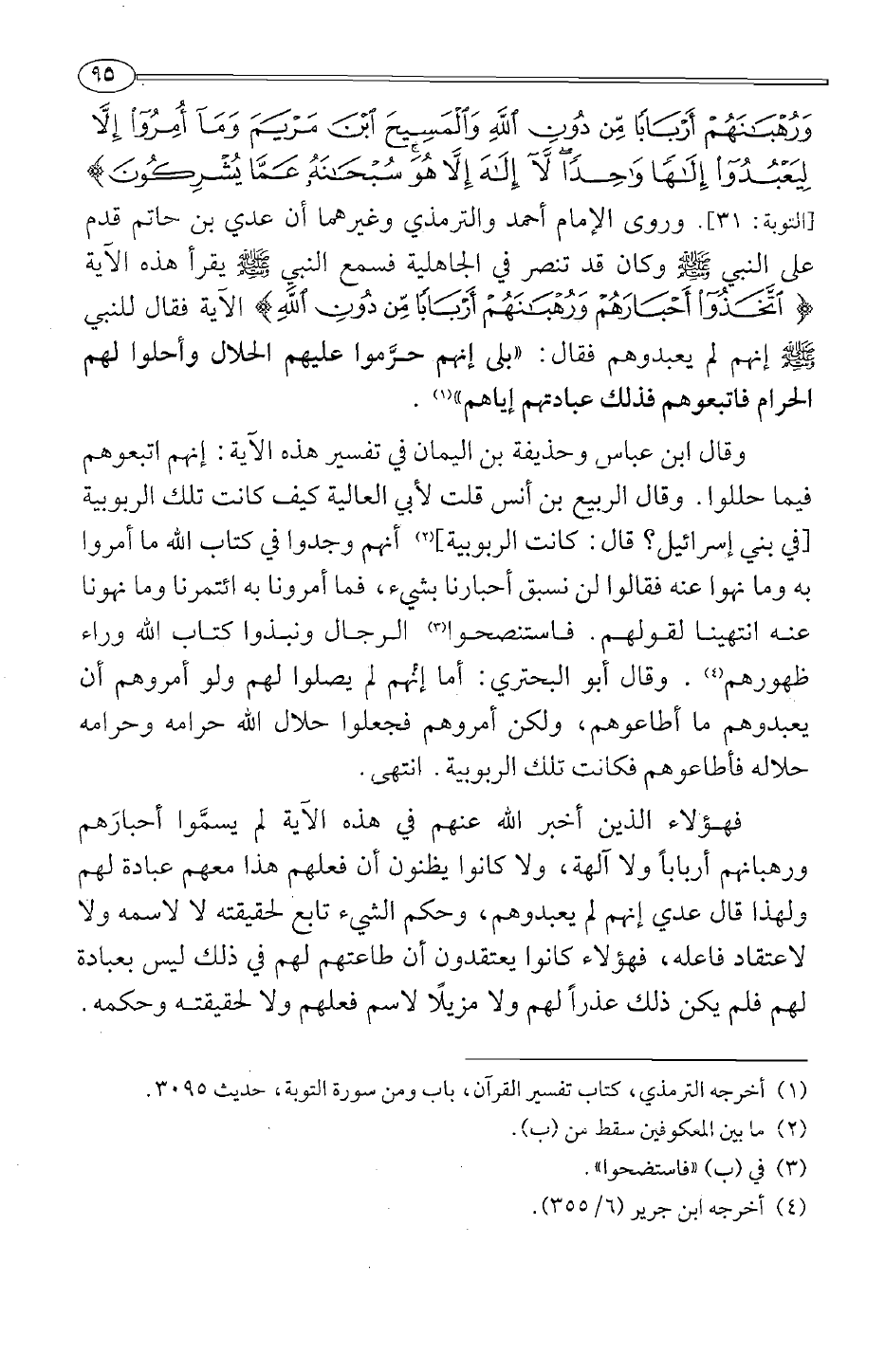 وَرُهْبَانَهُمْ أَرْبَابًا مِنْ دُونِ اللَّهِ وَالْمَسِيحَ ابْنَ مَرْيَمَ وَمَا أُمِرُوا إِلَّا لِيَعْبُدُوا إِلَهًا وَاحِدًا لَا إِلَهَ إِلَّا هُوَ سُبْحَانَهُ عَمَّا يُشْرِكُونَ} [التوبة 31] . وروى الإمام أحمد والترمذي وغيرهما أن عدي بن حاتم قدم على النبي صلى الله عليه وسلم وكان قد تنصر في الجاهلية فسمع النبي صلى الله عليه وسلم يقرأ هذه الآية {اتَّخَذُوا أَحْبَارَهُمْ وَرُهْبَانَهُمْ أَرْبَابًا مِنْ دُونِ اللَّهِ} الآية فقال للنبي صلى الله عليه وسلم إنهم لم يعبدوهم فقال: "بلى إنهم حرموا عليهم الحلال وأحلوا لهم الحرام فاتبعوهم فذلك عبادتهم إياهم"1.