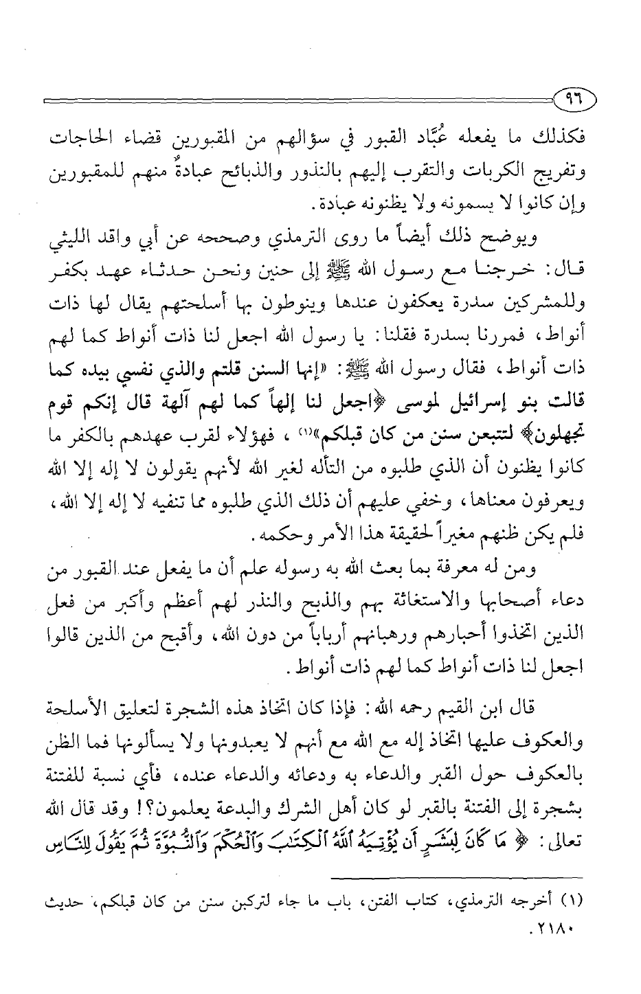 ويوضح ذلك أيضا ما روى الترمذي وصححه عن أبي واقد الليثي قال: خرجنا مع الرسول صلى الله عليه وسلم إلى حنين ونحن حدثاء عهد بكفر وللمشركين سدرة يعكفون عندها وينوطون بها أسلحتهم يقال لها ذات أنواط، فمررنا بسدرة فقلنا: يا رسول الله اجعل لنا ذات أنواط كما لهم ذات أنواط، فقال رسول الله صلى الله عليه وسلم: "إنها السنن قلتم والذي نفسي بيده كما قالت بنو إسرائيل لموسى {اجْعَل لَنَا إِلَهًا كَمَا لَهُمْ آلِهَةٌ قَالَ إِنَّكُمْ قَوْمٌ تَجْهَلُونَ} لتتبعن سنن من كان قبلكم"1، فهؤلاء لقرب عهدهم بالكفر ما كانوا يظنون أن الذي طلبوه من التأله لغير الله لأنهم يقولون لا إله إلا الله ويعرفون معناها، وخفي عليهم أن ذلك الذي طلبوه مما تنفيه لا إله إلا الله، فلم يكن ظنهم مغيرا لحقيقة هذا الأمر وحكمه.