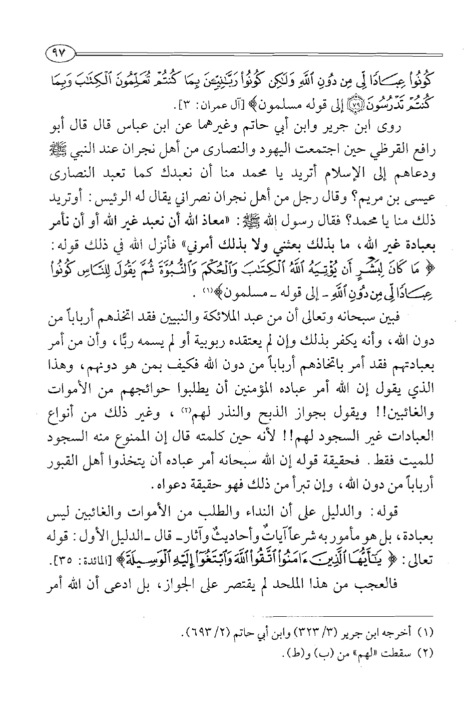 فبين سبحانه وتعالى أن من عبد الملائكة والنبيين فقد اتخذهم أربابا من دون الله، وأنه يكفر بذلك وإن لم يعتقده ربوبية أولم يسمه ربا، وأن من أمر بعبادتهم فقد أمر باتخاذهم أربابا من دون الله فكيف بمن هو دونهم، وهذا الذي يقول أن الله أمر عباده المؤمنين أن يطلبوا حوائجهم من الأموات والغائبين!! ويقول بجواز الذبح والنذر لهم2، وغير ذلك من أنواع العبادات غير السجود لهم!! لأنه حين كلمته قال إن الممنوع منه السجود للميت فقط. فحقيقة قوله إن الله سبحانه أمر عباده أن يتخذوا أهل القبور أربابا من دون الله، وإن من تبرأ من ذلك فهو حقيقة دعواه.