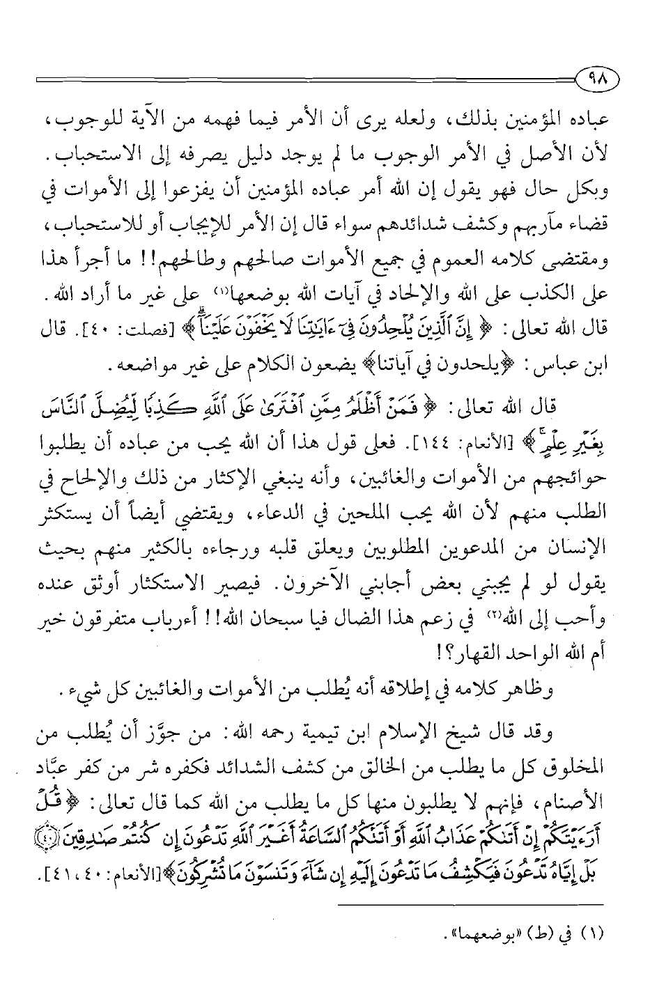 عباده المؤمنين بذلك، ولعله يري أن الأمر فيما فهمه من الآية للوجوب، لأن الأصل في الأمر الوجوب ما لم يوجد دليل يصرفه إلى الاستحباب، وبكل حال فهو يقول إن الله أمر عباده المؤمنين أن يفزعوا إلى الأموات في قضاء مآربهم وكشف شدائدهم سواء قال إن الأمر للإيجاب أو للإستحباب، ومقتضى كلامه العموم في جميع الأموات صالحهم وطالحهم!! ما أجرأ هذا على الكذب على الله والإلحاد في آيات الله بوضعها1 على غير ما أراد الله. قال تعالى: {إِنَّ الَّذِينَ يُلْحِدُونَ فِي آيَاتِنَا لَا يَخْفَوْنَ عَلَيْنَا} [فصلت:40] . قال ابن عباس {يلحدون في آياتنا} يضعون الكلام على غير موضعه.