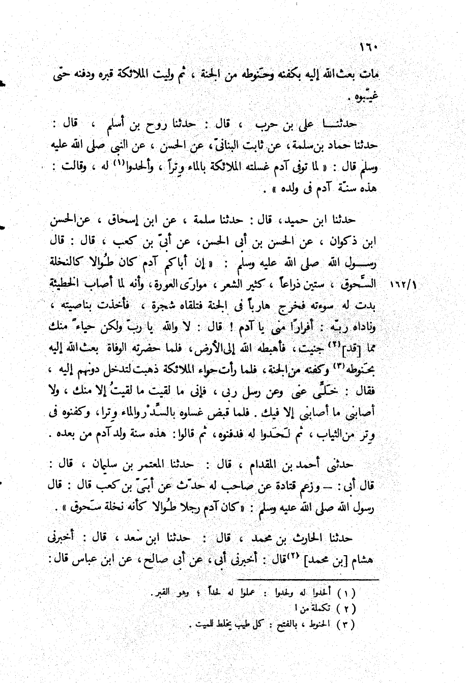 حَدَّثَنَا ابْنُ حُمَيْدٍ، قَالَ: حَدَّثَنَا سلمة، عن ابن إسحاق، عن الحسن ابن ذَكْوَانَ، عَنِ الْحَسَنِ بْنِ أَبِي الْحَسَنِ، عَنْ أُبَيِّ بْنِ كَعْبٍ، قَالَ: [قَالَ رَسُولُ اللَّهِ ص: إِنَّ أَبَاكُمْ آدَمَ كَانَ طُوَالا كَالنَّخْلَةِ السَّحُوقِ، سِتِّينَ ذِرَاعًا، كَثِيرَ الشَّعْرِ، مُوَارَى الْعَوْرَةِ، وَأَنَّهُ لَمَّا أَصَابَ الْخَطِيئَةَ بَدَتْ لَهُ سَوْءَتُهُ فَخَرَجَ هَارِبًا فِي الْجَنَّةِ فَتَلَقَّاهُ شَجَرَةٌ، فَأَخَذَتْ بِنَاصِيَتِهِ، وَنَادَاهُ رَبُّهُ: أَفِرَارًا مِنِّي يَا آدَمُ! قَالَ: لا وَاللَّهِ يَا رَبِّ وَلَكِنْ حَيَاءً مِنْكَ مما قد جَنَيْتُ، فَأَهْبَطَهُ اللَّهُ إِلَى الأَرْضِ، فَلَمَّا حَضَرَتْهُ الْوَفَاةُ بَعَثَ اللَّهُ إِلَيْهِ بِحَنُوطِهِ وَكَفَنِهِ مِنَ الْجَنَّةِ، فَلَمَّا رَأَتْ حَوَّاءُ الْمَلائِكَةَ ذَهَبَتْ لِتَدْخُلَ دونهم اليه، فقال: خلى عَنِّي وَعَنْ رُسُلِ رَبِّي، فَإِنِّي مَا لَقِيتُ مَا لَقِيتُ إِلا مِنْكِ، وَلا أَصَابَنِي مَا أَصَابَنِي إِلا فِيكِ فَلَمَّا قُبِضَ غَسَّلُوهُ بِالسِّدْرِ وَالْمَاءِ وِتْرًا، وَكَفَّنُوهُ فِي وِتْرٍ مِنَ الثِّيَابِ، ثُمَّ لَحَدُوا لَهُ فَدَفَنُوهُ،] ثُمَّ قَالُوا: هَذِهِ سُنَّةُ وَلَدِ آدَمَ مِنْ بَعْدِهِ.