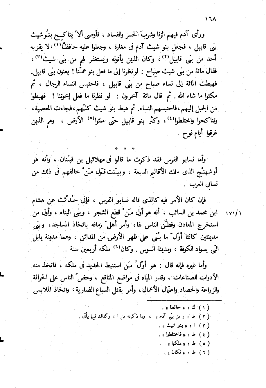 وَأَمَّا نَسَّابُو الْفُرْسِ فَقَدْ ذَكَرْتُ مَا قَالُوا فِي مهلائِيلَ بْنِ قينانَ، وَأَنَّهُ هُوَ أوشهنجَ الَّذِي مَلَكَ الأَقَالِيمَ السَّبْعَةَ، وَبَيَّنْتُ قَوْلَ مَنْ خَالَفَهُمْ فِي ذَلِكَ مِنْ نَسَّابِي الْعَرَبِ.
