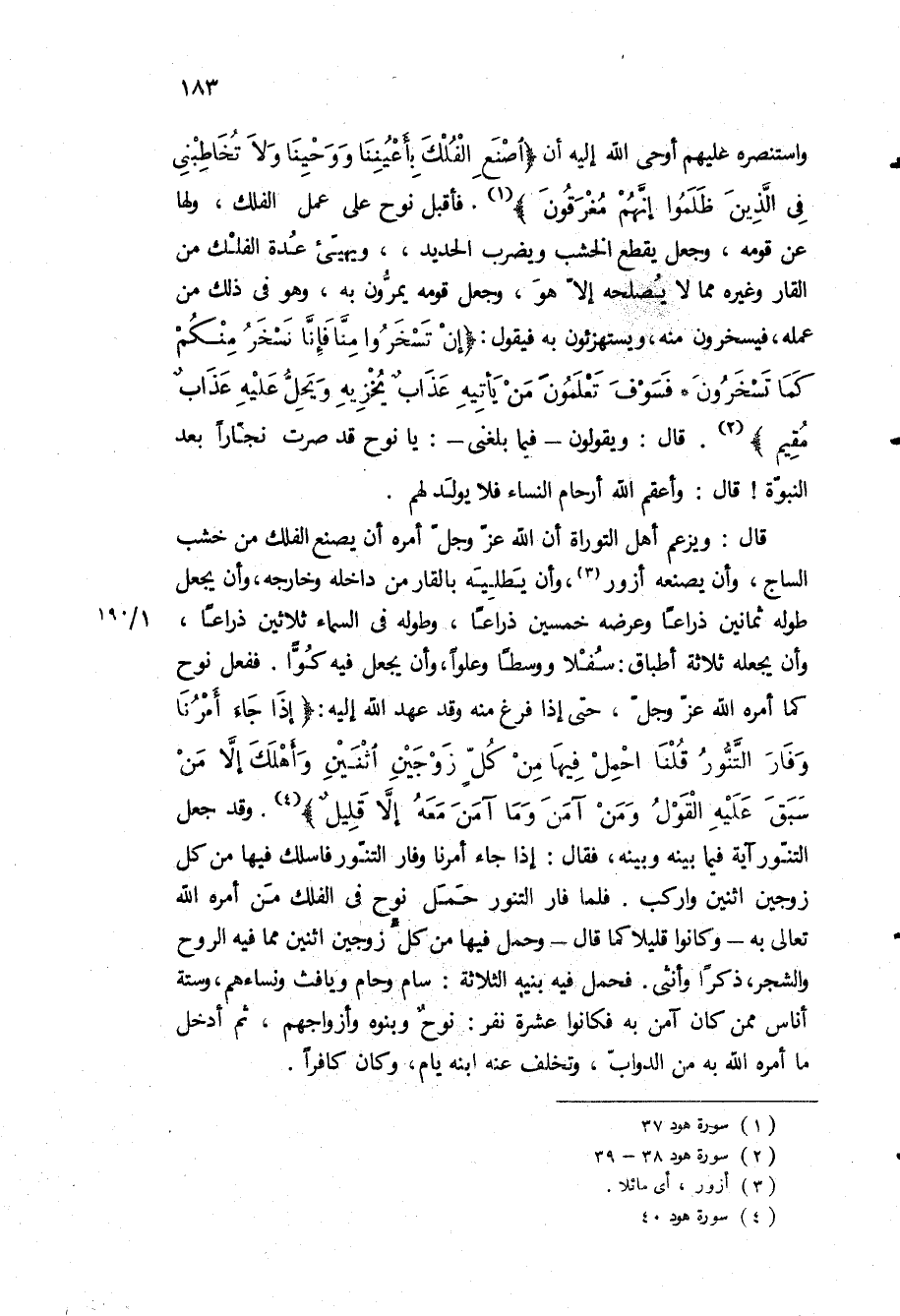 قال: ويزعم أهل التوراة أن الله عز وجل أمره أن يصنع الفلك من خشب الساج، وأن يصنعه أزور، وأن يطليه بالقار من داخله وخارجه، وأن يجعل طوله ثمانين ذراعا وعرضه خمسين ذراعا، وطوله في السماء ثلاثين ذراعا، وأن يجعله ثلاثة أطباق: سفلا ووسطا وعلوا، وأن يجعل فيه كوا ففعل نوح كما امره الله عز وجل، حتى إذا فرغ منه وقد عهد الله إليه: «إِذا جاءَ أَمْرُنا وَفارَ التَّنُّورُ قُلْنَا احْمِلْ فِيها مِنْ كُلٍّ زَوْجَيْنِ اثْنَيْنِ وَأَهْلَكَ إِلَّا مَنْ سَبَقَ عَلَيْهِ الْقَوْلُ وَمَنْ آمَنَ وَما آمَنَ مَعَهُ إِلَّا قَلِيلٌ» وقد جعل التنور آية فيما بينه وبينه، فقال: إذا جاء أمرنا وفار التنور فاسلك فيها من كل زوجين اثنين واركب فلما فار التنور حمل نوح في الفلك من أمره الله تعالى به- وكانوا قليلا كما قال- وحمل فيها من كل زوجين اثنين مما فيه الروح والشجر، ذكرا وأنثى فحمل فيه بنيه الثلاثة: سام وحام ويافث ونساءهم، وستة أناس ممن كان آمن به فكانوا عشرة نفر: نوح وبنوه وأزواجهم، ثم أدخل ما أمره الله به من الدواب، وتخلف عنه ابنه يام، وكان كافرا