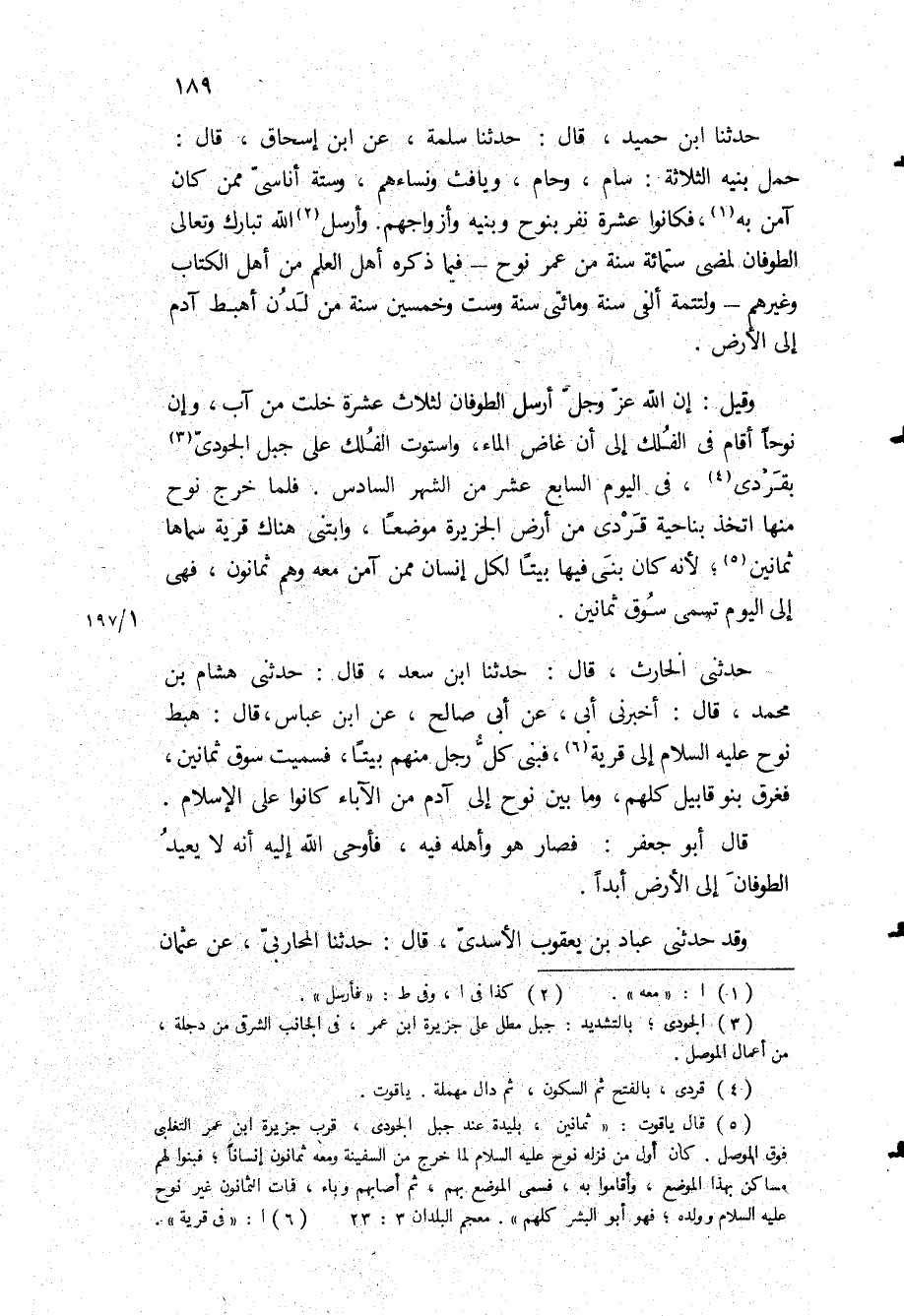 حَدَّثَنِي الْحَارِثُ، قَالَ: حَدَّثَنَا ابْنُ سَعْدٍ، قَالَ: حَدَّثَنِي هِشَامُ بْنُ مُحَمَّدٍ، قال: أخبرني أبي، عن أبي صالح، عن ابن عباس، قال: هبط نوح ع إِلَى قَرْيَةٍ، فَبَنَى كُلُّ رَجُلٍ مِنْهُمْ بَيْتًا، فَسُمِّيَتْ سُوقَ ثَمَانِينَ، فَغَرِقَ بَنُو قَابِيلَ كُلُّهُمْ، وَمَا بَيْنَ نُوحٍ إِلَى آدَمَ مِنَ الآبَاءِ كَانُوا عَلَى الإِسْلامِ.