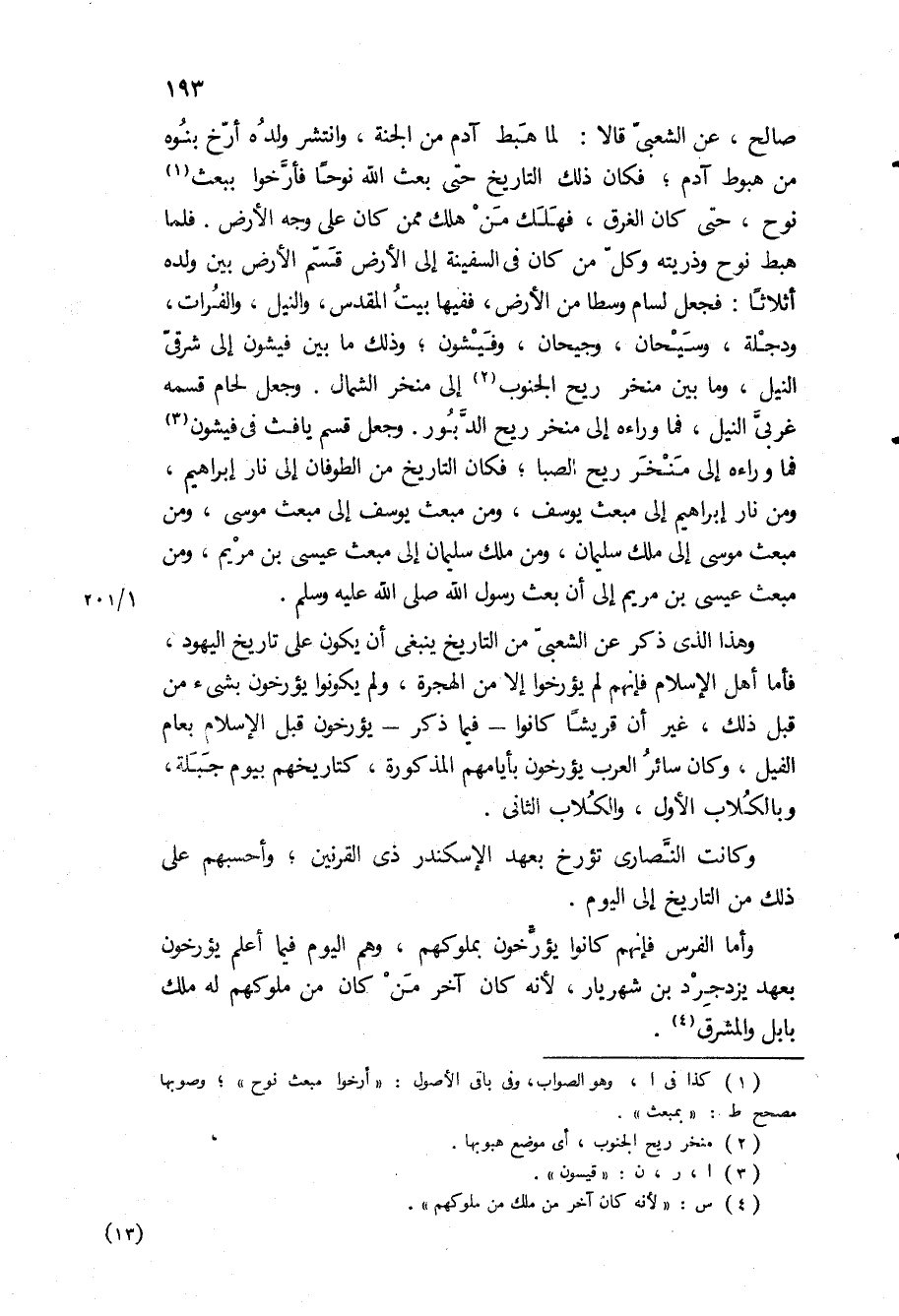 صالح، عن الشعبي قالا: لما هبط آدم من الجنة، وانتشر ولده أرخ بنوه من هبوط آدم، فكان ذلك التاريخ حتى بعث الله نوحا فارخوا ببعث نوح، حتى كان الغرق، فهلك من هلك ممن كان على وجه الأرض. فلما هبط نوح وذريته وكل من كان في السفينة إلى الأرض قسم الأرض بين ولده أثلاثا: فجعل لسام وسطا من الأرض، ففيها بيت المقدس، والنيل، والفرات، ودجلة، وسيحان، وجيحان، وفيشون، وذلك ما بين فيشون إلى شرقي النيل، وما بين منخر ريح الجنوب إلى منخر الشمال. وجعل لجام قسمه غربي النيل، فما وراءه إلى منخر ريح الدبور. وجعل قسم يافث في فيشون فما وراءه إلى منخر ريح الصبا، فكان التاريخ من الطوفان إلى نار إبراهيم، ومن نار إبراهيم إلى مبعث يوسف، ومن مبعث يوسف إلى مبعث موسى، ومن مبعث موسى إلى ملك سليمان، ومن ملك سليمان إلى مبعث عيسى بن مريم، ومن مبعث عيسى بن مريم الى ان بعث رسول ص.