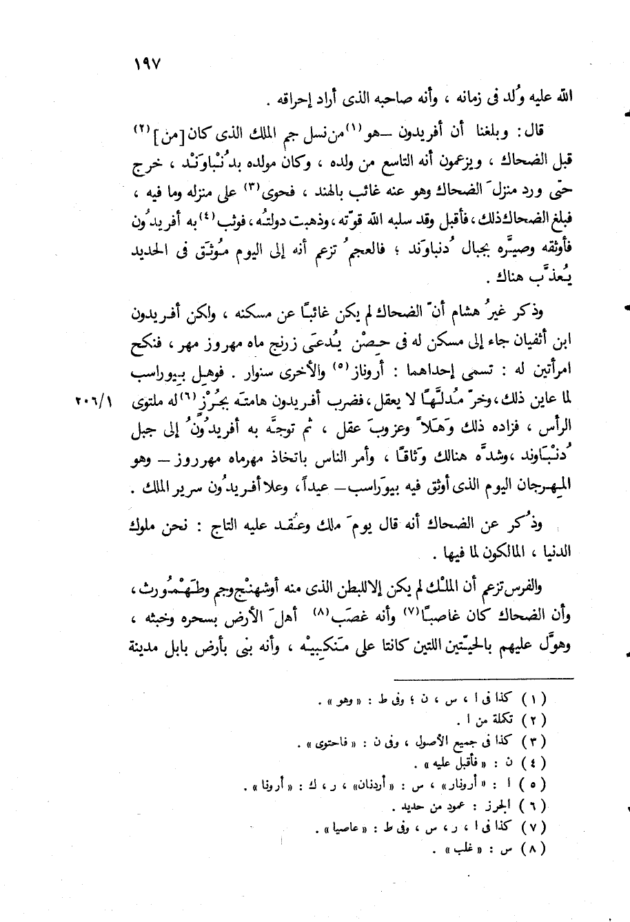 والفرس تزعم أن الملك لم يكن إلا للبطن الذى منه اوشهنج وجم وطهمورث، وان الضحاك كان غاصبا وأنه غصب أهل الأرض بسحره وخبثه، وهول عليهم بالحيتين اللتين كانتا على منكبيه، وأنه بنى بأرض بابل مدينة