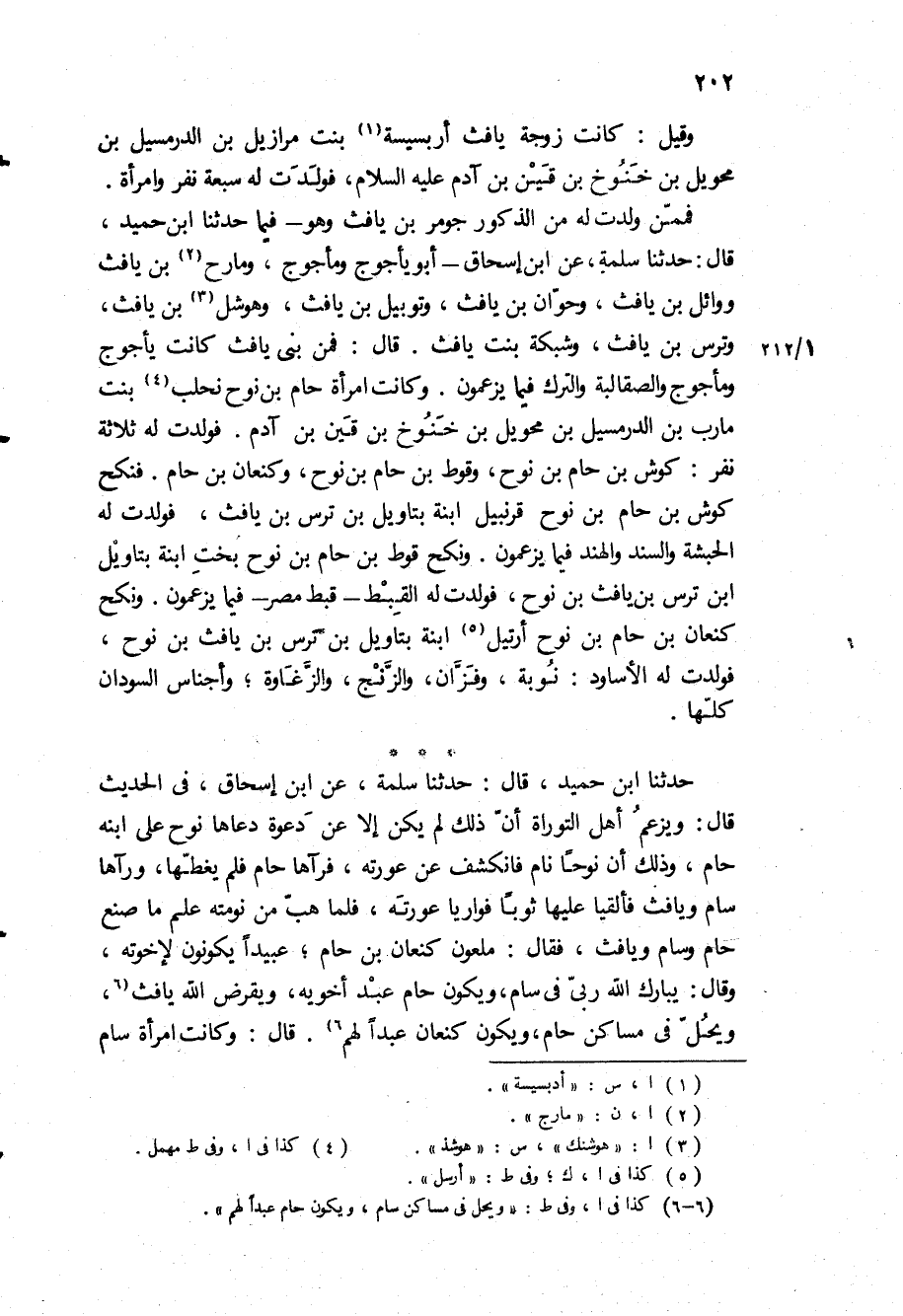 فممن ولدت له من الذكور جومر بن يافث وهو- فيما حَدَّثَنَا ابن حميد، قال: حَدَّثَنَا سلمة، عن ابن إسحاق- أبو يأجوج ومأجوج، ومارح بن يافث ووائل بن يافث، وحوان بن يافث، وتوبيل بن يافث، وهوشل بن يافث، وترس بن يافث، وشبكة بنت يافث قال: فمن بني يافث كانت يأجوج ومأجوج والصقالبة والترك فيما يزعمون وكانت امرأة حام بن نوح نحلب بنت مارب بن الدرمسيل بن محويل بن خنوخ بن قين بن آدم فولدت له ثلاثة نفر: كوش بن حام بن نوح، وقوط بن حام بن نوح، وكنعان بن حام فنكح كوش بن حام بن نوح قرنبيل ابنة بتاويل بن ترس بن يافث، فولدت له الحبشة والسند والهند فيما يزعمون ونكح قوط بن حام بن نوح بخت ابنه بتاويل ابن ترس بن يافث بن نوح، فولدت له القبط- قبط مصر- فيما يزعمون ونكح كنعان بن حام بن نوح ارتيل ابنة بتاويل بن ترس بن يافث بن نوح، فولدت له الأساود: نوبة، وفزان، والزنج، والزغاوة، وأجناس السودان كلها.