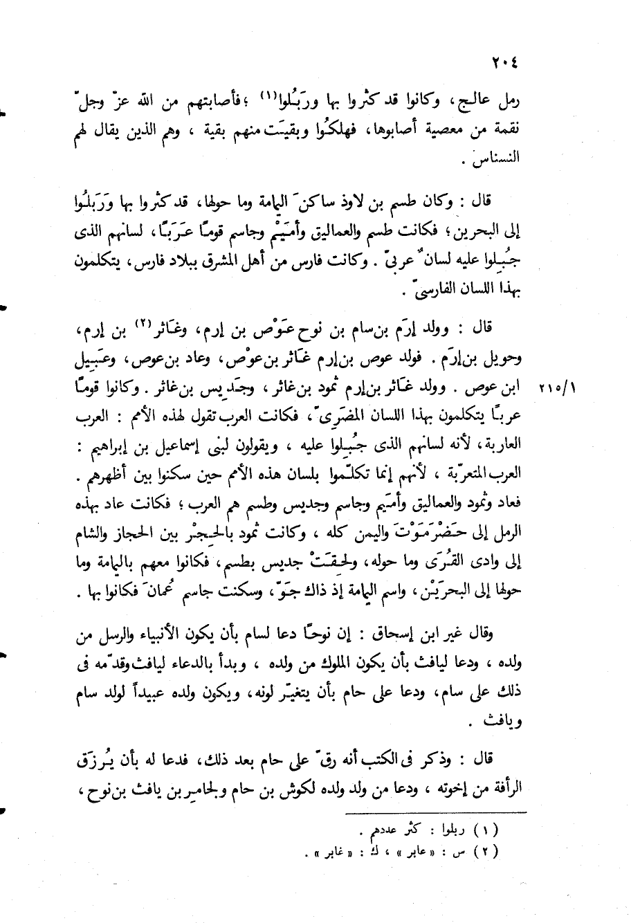 قَالَ: وَوَلَدُ إرَمَ بْنِ سَامَ بْنِ نُوحٍ عوصُ بْنُ إِرمَ، وَغَاثِرُ بْنُ إِرمَ، وَحويلُ بْنُ إرمَ فَوَلَدُ عوصِ بْنِ إرمَ غَاثِرُ بْنُ عوصٍ، وَعَادُ بْنُ عوصٍ، وَعُبَيْلُ ابن عوصٍ وَوَلَدُ غَاثِرِ بْنِ إرمَ ثَمُودُ بْنُ غَاثِرٍ، وَجُدَيْسُ بْنُ غَاثِرٍ وَكَانُوا قَوْمًا عَرَبًا يَتَكَلَّمُونَ بِهَذَا اللِّسَانِ الْمُضَرِيِّ، فَكَانَتِ الْعَرَبُ تَقُولُ لِهَذِهِ الأُمَمِ: الْعَرَبُ الْعَارِبَةُ، لأَنَّهُ لِسَانُهُمُ الَّذِي جُبِلُوا عَلَيْهِ، وَيَقُولُونَ لِبَنِي إِسْمَاعِيلَ بْنِ إِبْرَاهِيمَ: