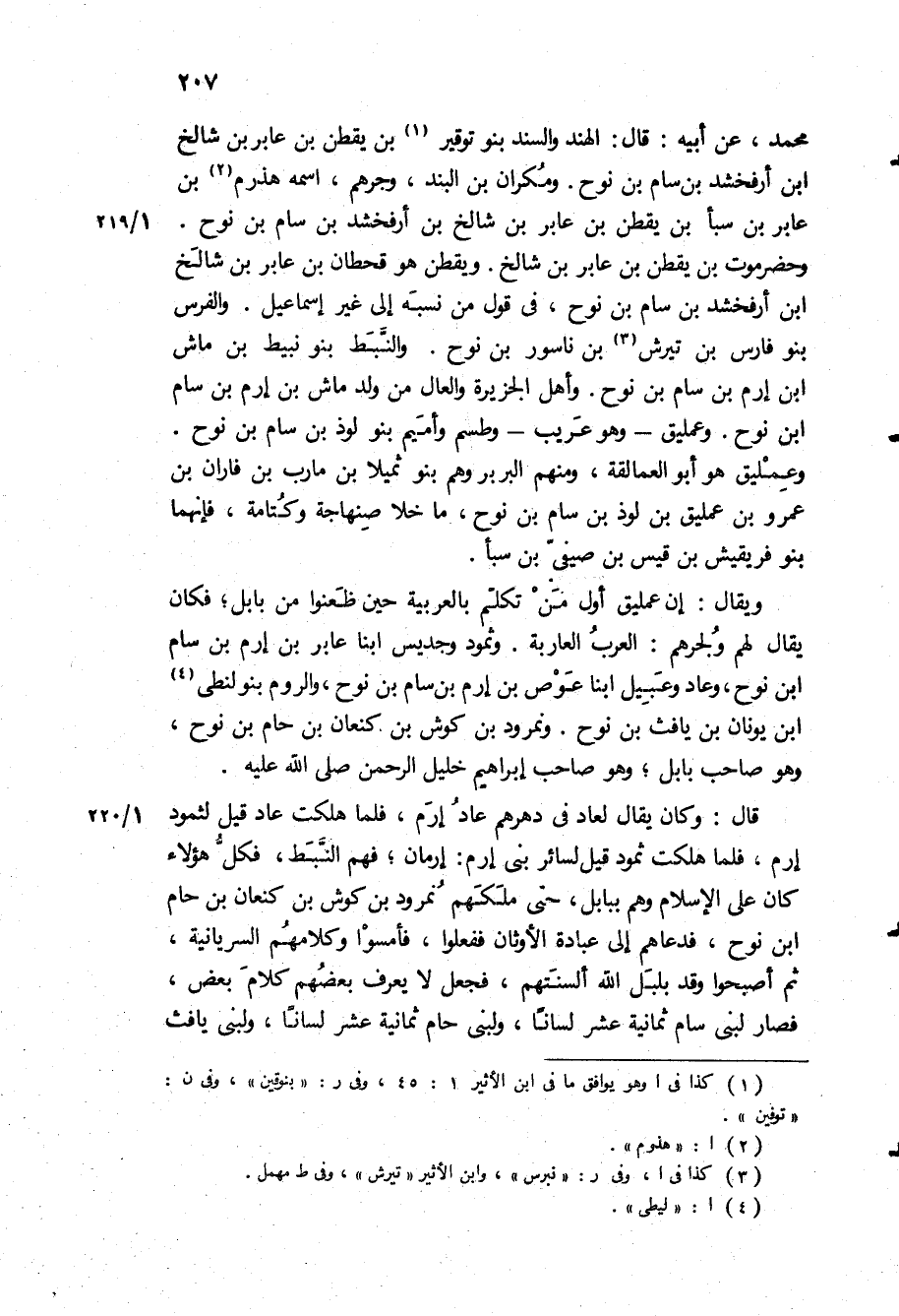 محمد، عن أبيه: قال: الهند والسند بنو توقير بن يقطن بن عابر بن شالخ ابن أرفخشد بن سام بن نوح ومكران بن البند، وجرهم، اسمه هذرم بن عابر بن سبأ بن يقطن بن عابر بن شالخ بن أرفخشد بن سام بن نوح.