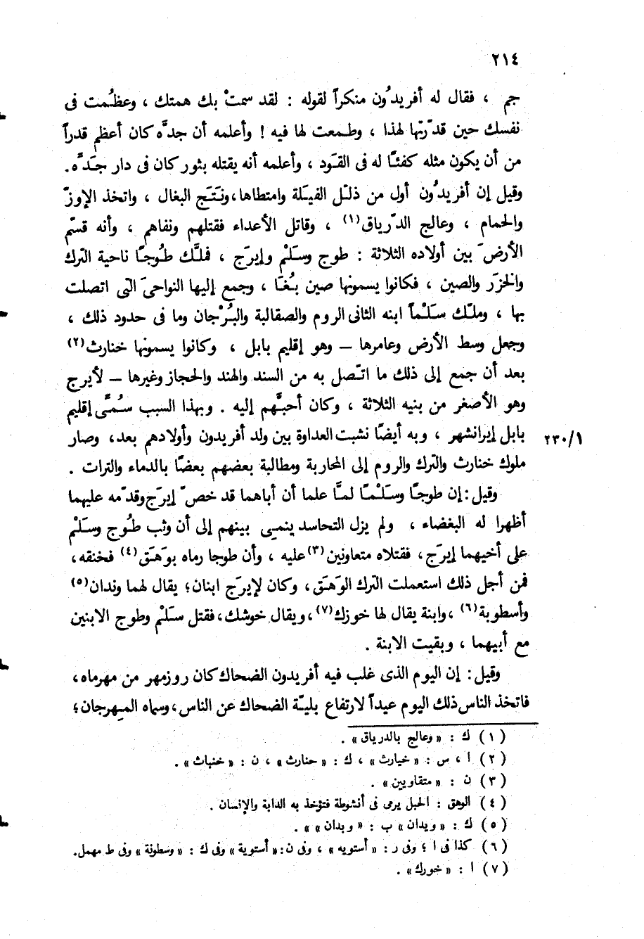 وقيل إن أفريدون أول من ذلل الفيلة وامتطاها، ونتج البغال، واتخذ الإوز والحمام، وعالج الدرياق، وقاتل الأعداء فقتلهم ونفاهم، وأنه قسم الأرض بين أولاده الثلاثة: طوج وسلم وإيرج، فملك طوجا ناحية الترك والخزر والصين، فكانوا يسمونها صين بغا، وجمع إليها النواحي التي اتصلت بها، وملك سلما ابنه الثاني الروم والصقالبة والبرجان وما في حدود ذلك، وجعل وسط الأرض وعامرها- وهو إقليم بابل، وكانوا يسمونها خنارث بعد أن جمع إلى ذلك ما اتصل به من السند والهند والحجاز وغيرها- لايرج وهو الاصغر من بينه الثلاثة، وكان أحبهم إليه وبهذا السبب سمي إقليم بابل إيرانشهر، وبه أيضا نشبت العداوة بين ولد أفريدون وأولادهم بعد، وصار ملوك خنارث والترك والروم إلى المحاربة ومطالبة بعضهم بعضا بالدماء والتراث.