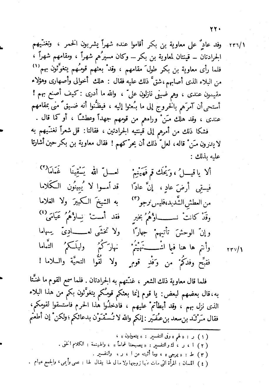 وفد عاد على معاوية بن بكر أقاموا عنده شهرا يشربون الخمر، وتغنيهم الجرادتان- قينتان لمعاوية بن بكر- وكان مسيرهم شهرا، ومقامهم شهرا، فلما رأى معاوية بن بكر طول مقامهم، وقد بعثهم قومهم يتغوثون بهم من البلاء الذي أصابهم، شق ذلك عليه فقال: هلك أخوالي وأصهاري وهؤلاء مقيمون عندي، وهم ضيفي نازلون علي، والله ما أدري: كيف أصنع بهم! أستحي أن آمرهم بالخروج إلى ما بعثوا إليه، فيظنوا أنه ضيق مني بمقامهم عندي، وقد هلك من وراءهم من قومهم جهدا وعطشا، أو كما قال.