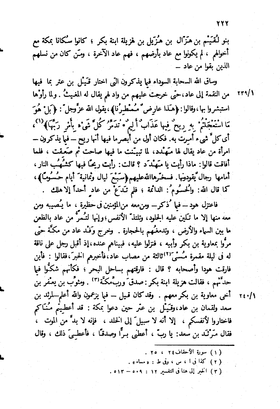 فاعتزل هود- فيما ذكر- ومن معه من المؤمنين في حظيرة، ما يصيبه ومن معه منها إلا ما تلين عليه الجلود، وتلتذ الأنفس، وانها لتمر من عاد بالظعن ما بين السماء والأرض، وتدمغهم بالحجارة وخرج وفد عاد من مكة حتى مروا بمعاوية بن بكر وابيه، فنزلوا عليه، فبيناهم عنده، إذ أقبل رجل على ناقة له في ليله مقمره مسى ثالثة من مصاب عاد، فأخبرهم الخبر، فقالوا: فأين فارقت هودا وأصحابه؟ قال: فارقتهم بساحل البحر، فكأنهم شكوا فيما حدثهم، فقالت هزيلة ابنة بكر: صدق ورب مكة ومثوب بن يعفر بن أخي معاوية بن بكر معهم وقد كان قيل- فيما يزعمون والله أعلم- لمرثد بن سعد ولقمان بن عاد، وقيل بن عتر حين دعوا بمكة: قد أعطيتم مناكم فاختاروا لأنفسكم، إلا أنه لا سبيل إلى الخلد، فإنه لا بد من الموت، فقال مرثد بن سعد: يا رب، أعطني برا وصدقا، فأعطي ذلك، وقال