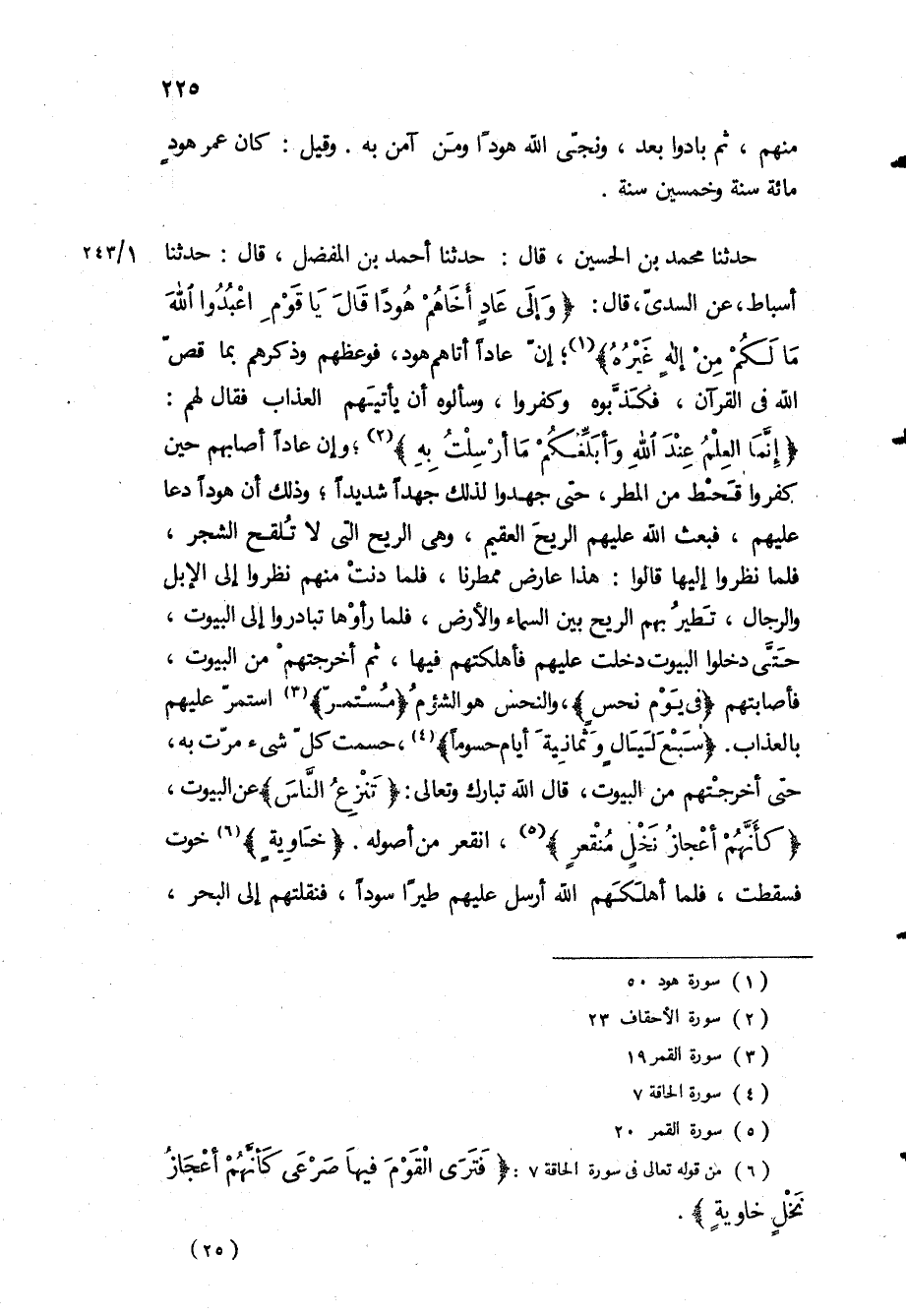 «إِنَّمَا الْعِلْمُ عِنْدَ اللَّهِ وَأُبَلِّغُكُمْ ما أُرْسِلْتُ بِهِ» ، وإن عادا أصابهم حين كفروا قحط من المطر، حتى جهدوا لذلك جهدا شديدا، وذلك أن هودا دعا عليهم، فبعث الله عليهم الريح العقيم، وهي الريح التي لا تلقح الشجر، فلما نظروا إليها قالوا: هذا عارض ممطرنا، فلما دنت منهم نظروا إلى الإبل والرجال، تطير بهم الريح بين السماء والأرض، فلما راوها تبادروا الى البيوت، حتى دخلوا البيوت دخلت عليهم فأهلكتهم فيها، ثم أخرجتهم من البيوت، فأصابتهم «فِي يَوْمِ نَحْسٍ» ، والنحس هو الشؤم «مُسْتَمِرٍّ» استمر عليهم بالعذاب «سَبْعَ لَيالٍ وَثَمانِيَةَ أَيَّامٍ حُسُوماً» ، حسمت كل شيء مرت به، حتى أخرجتهم من البيوت، قال الله تبارك وتعالى: «تَنْزِعُ النَّاسَ» عن البيوت، «كَأَنَّهُمْ أَعْجازُ نَخْلٍ مُنْقَعِرٍ» ، انقعر من أصوله «خاوِيَةٍ» خوت فسقطت، فلما أهلكهم الله أرسل عليهم طيرا سودا، فنقلتهم الى البحر،
