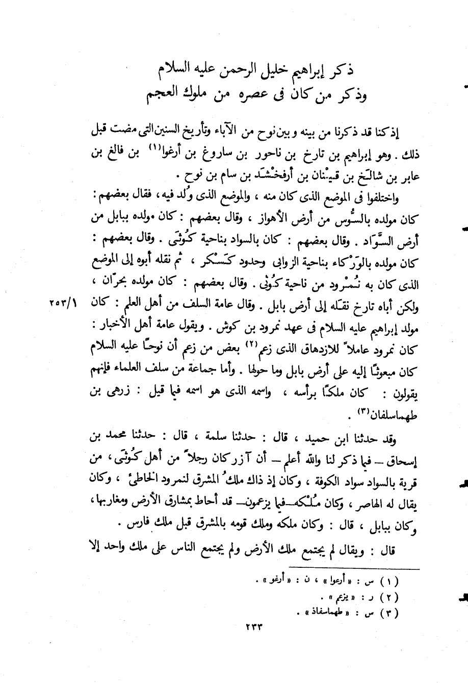 وقد حَدَّثَنَا ابْنُ حُمَيْدٍ، قال: حَدَّثَنَا سلمة، قال: حَدَّثَنَا محمد بن إسحاق- فيما ذكر لنا والله أعلم- أن آزر كان رجلا من أهل كوثى، من قرية بالسواد سواد الكوفة، وكان إذ ذاك ملك المشرق لنمرود الخاطئ، وكان يقال له الهاصر، وكان ملكه- فيما يزعمون- قد أحاط بمشارق الأرض ومغاربها، وكان ببابل، قال: وكان ملكه وملك قومه بالمشرق قبل ملك فارس.