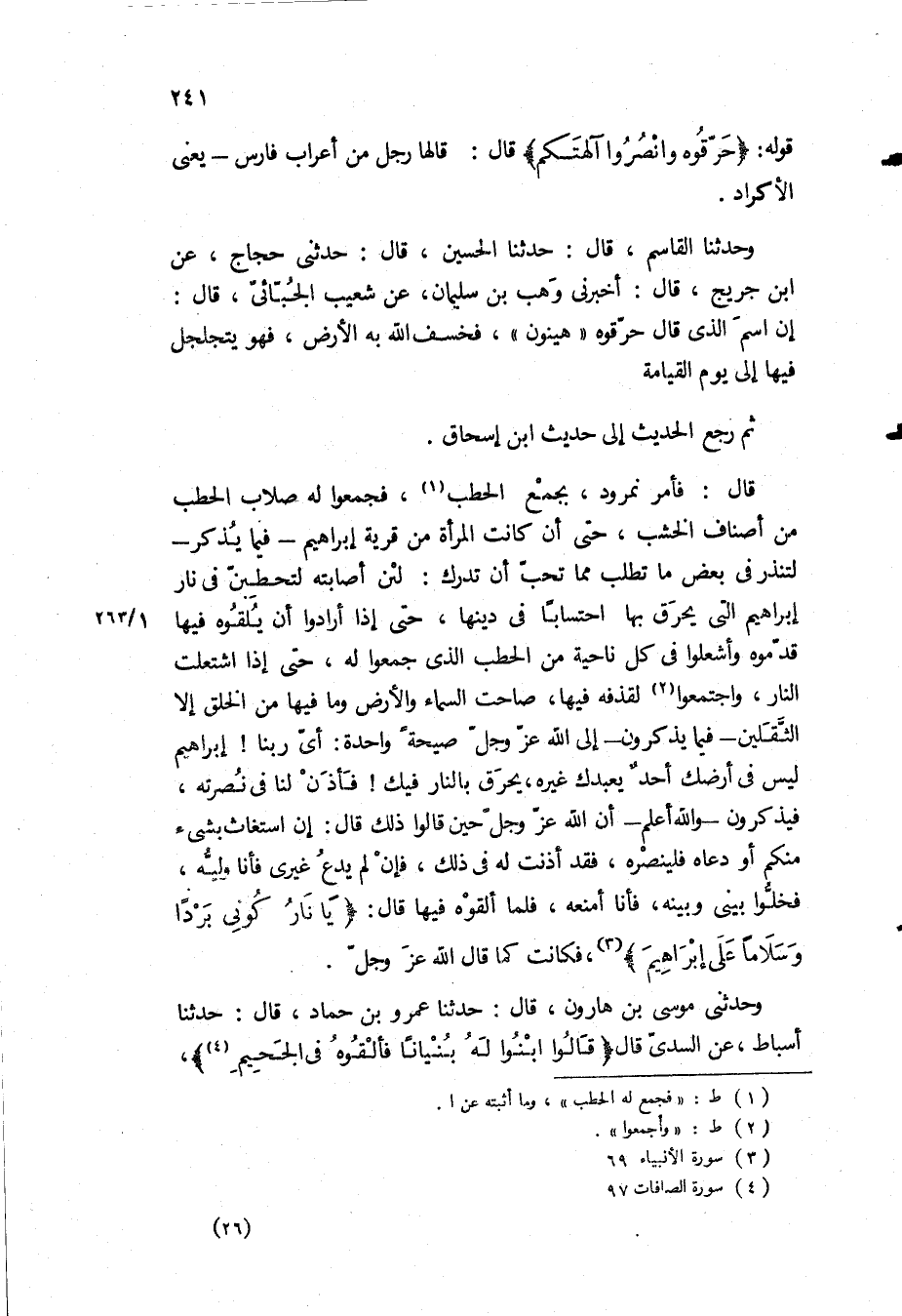 قال: فامر نمرود، بجمع الحطب، فجمعوا له صلاب الحطب من أصناف الخشب، حتى إن كانت المرأة من قرية إبراهيم- فيما يذكر- لتنذر في بعض ما تطلب مما تحب ان تدرك: لئن أصابته لتحطبن في نار إبراهيم التي يحرق بها احتسابا في دينها، حتى إذا أرادوا أن يلقوه فيها قدموه وأشعلوا في كل ناحية من الحطب الذي جمعوا له، حتى إذا اشتعلت النار، واجتمعوا لقذفه فيها، صاحت السماء والأرض وما فيها من الخلق إلا الثقلين- فيما يذكرون- إلى الله عز وجل صيحة واحدة: أي ربنا! إبراهيم ليس في أرضك أحد يعبدك غيره، يحرق بالنار فيك! فأذن لنا في نصرته، فيذكرون- والله أعلم- أن الله عز وجل حين قالوا ذلك قال: إن استغاث بشيء منكم أو دعاه فلينصره، فقد أذنت له في ذلك، فإن لم يدع غيري فأنا وليه، فخلوا بيني وبينه، فأنا أمنعه، فلما ألقوه فيها قال: «يَا نارُ كُونِي بَرْداً وَسَلاماً عَلى إِبْراهِيمَ» ، فكانت كما قال الله عز وجل.