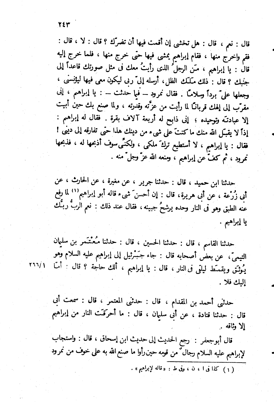 حَدَّثَنَا القاسم، قال: حَدَّثَنَا الحسين، قال: حَدَّثَنَا معتمر بن سليمان التيمي، عن بعض أصحابه قال: جاء جبرئيل الى ابراهيم ع وهو يوثق ويقمط ليلقى في النار، قال: يا إبراهيم، ألك حاجة؟ قال: أما إليك فلا.