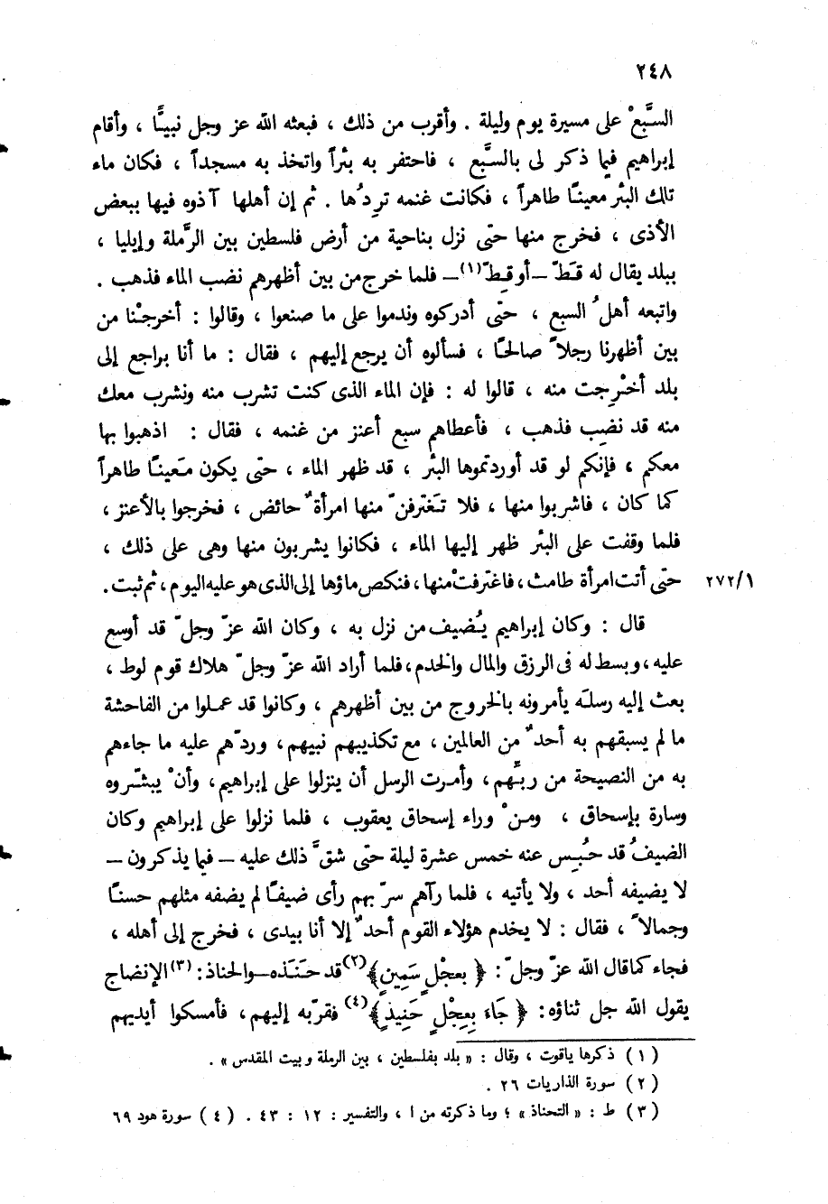 السبع على مسيرة يوم وليلة وأقرب من ذلك، فبعثه الله عز وجل نبيا، وأقام إبراهيم فيما ذكر لي بالسبع، فاحتفر به بئرا واتخذ به مسجدا، فكان ماء تلك البئر معينا طاهرا، فكانت غنمه تردها ثم إن أهلها آذوه فيها ببعض الأذى، فخرج منها حتى نزل بناحية من أرض فلسطين بين الرملة وإيليا، ببلد يقال له قَط- أو قِط- فلما خرج من بين أظهرهم نضب الماء فذهب.
