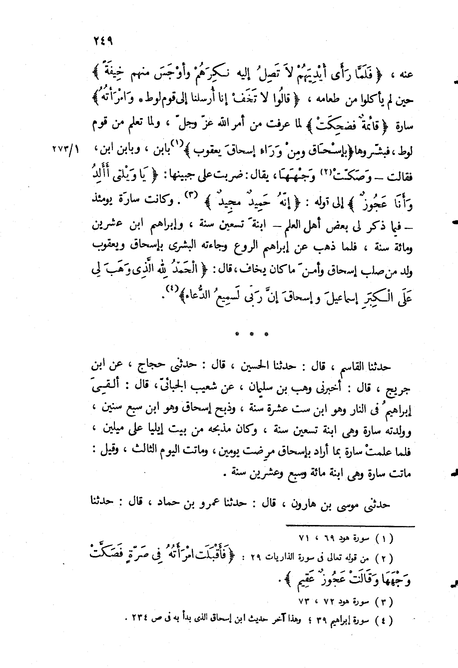 عنه، «فَلَمَّا رَأى أَيْدِيَهُمْ لا تَصِلُ إِلَيْهِ نَكِرَهُمْ وَأَوْجَسَ مِنْهُمْ خِيفَةً» حين لم يأكلوا من طعامه، «قالُوا لا تَخَفْ إِنَّا أُرْسِلْنا إِلى قَوْمِ لُوطٍ وَامْرَأَتُهُ» ساره «قائِمَةٌ فَضَحِكَتْ» لما عرفت من أمر الله عز وجل، ولما تعلم من قوم لوط، فبشروها «بِإِسْحاقَ وَمِنْ وَراءِ إِسْحاقَ يَعْقُوبَ» بابن، وبابن ابن، فقالت- وصكت وجهها، يقال: ضربت على جبينها: «يا وَيْلَتى أَأَلِدُ وَأَنَا عَجُوزٌ» إلى قوله: «إِنَّهُ حَمِيدٌ مَجِيدٌ» وكانت سارة يومئذ- فيما ذكر لي بعض أهل العلم- ابنة تسعين سنة، وإبراهيم ابن عشرين ومائة سنة، فلما ذهب عن إبراهيم الروع وجاءته البشرى بإسحاق ويعقوب ولد من صلب إسحاق وأمن ما كان يخاف، قال: «الْحَمْدُ لِلَّهِ الَّذِي وَهَبَ لِي عَلَى الْكِبَرِ إِسْماعِيلَ وَإِسْحاقَ إِنَّ رَبِّي لَسَمِيعُ الدُّعاءِ» .