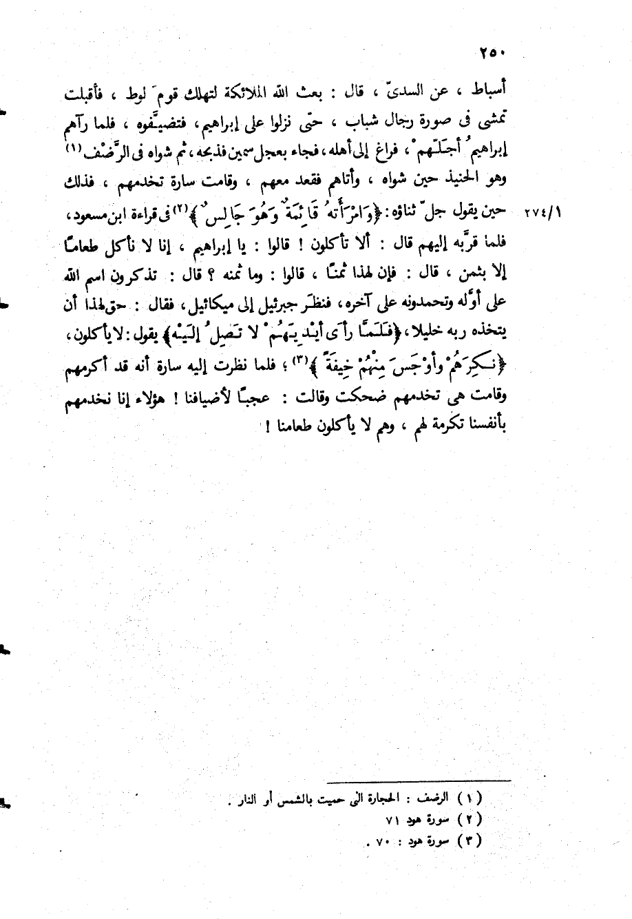 أسباط، عن السدي، قال: بعث الله الملائكة لتهلك قوم لوط، فأقبلت تمشي في صورة رجال شباب، حتى نزلوا على إبراهيم، فتضيفوه، فلما رآهم إبراهيم أجلهم، فراغ إلى أهله، فجاء بعجل سمين فذبحه، ثم شواه في الرضف وهو الحنيذ حين شواه، وأتاهم فقعد معهم، وقامت سارة تخدمهم، فذلك حين يقول جل ثناؤه: «وَامْرَأَتُهُ قائِمَةٌ وَهُوَ جَالِسٌ» في قراءة ابن مسعود، فلما قربه إليهم قال: ألا تأكلون! قالوا: يا إبراهيم، إنا لا نأكل طعاما إلا بثمن، قال: فإن لهذا ثمنا، قالوا: وما ثمنه؟ قال: تذكرون اسم الله على أوله وتحمدونه على آخره، فنظر جبرئيل إلى ميكائيل، فقال: حق لهذا أن يتخذه ربه خليلا، «فَلَمَّا رَأى أَيْدِيَهُمْ لا تَصِلُ إِلَيْهِ» يقول: لا يأكلون، «نَكِرَهُمْ وَأَوْجَسَ مِنْهُمْ خِيفَةً» ، فلما نظرت إليه سارة أنه قد أكرمهم وقامت هي تخدمهم ضحكت وقالت: عجبا لأضيافنا! هؤلاء إنا نخدمهم بأنفسنا تكرمة لهم، وهم لا يأكلون طعامنا!