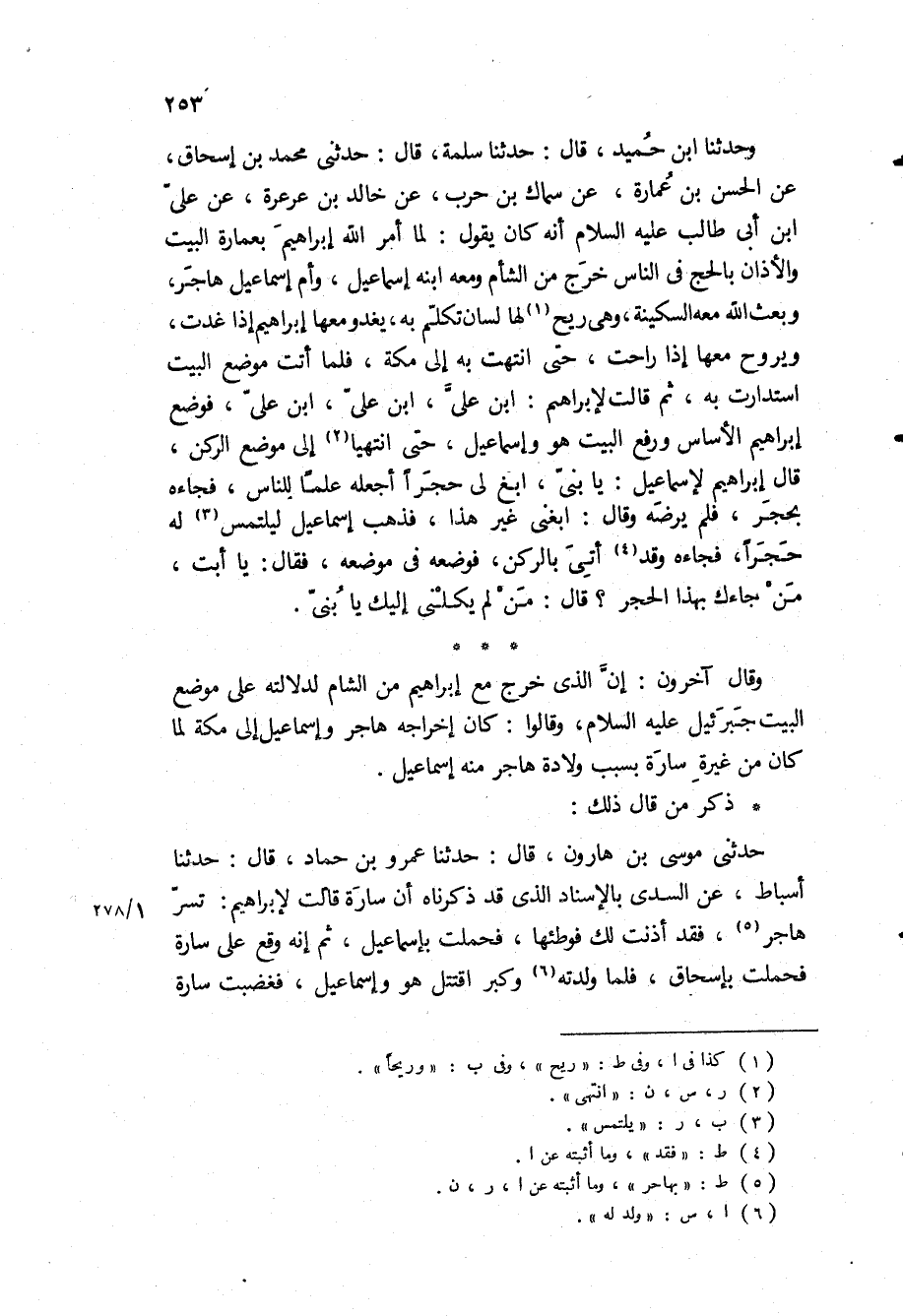 وَحَدَّثَنَا ابْنُ حُمَيْدٍ، قَالَ: حَدَّثَنَا سَلَمَةُ، قَالَ: حدثني محمد بن إسحاق، عن الحسن بن عُمَارَةَ، عَنْ سِمَاكِ بْنِ حَرْبٍ، عَنْ خَالِدِ بن عرعرة، [عن على ابن ابى طالب ع أَنَّهُ كَانَ يَقُولُ: لَمَّا أَمَرَ اللَّهُ إِبْرَاهِيمَ بِعِمَارَةِ الْبَيْتِ وَالأَذَانِ بِالْحَجِّ فِي النَّاسِ خَرَجَ مِنَ الشَّامِ وَمَعَهُ ابْنُهُ إِسْمَاعِيلُ، وَأُمُّ إِسْمَاعِيلَ هاجر، وبعث الله معه السكينة، وهي رِيحٌ لَهَا لِسَانٌ تَكَلَّمُ بِهِ، يَغْدُو مَعَهَا إِبْرَاهِيمُ إِذَا غَدَتْ، وَيَرُوحُ مَعَهَا إِذَا رَاحَتْ، حَتَّى انْتَهَتْ بِهِ إِلَى مَكَّةَ، فَلَمَّا أَتَتْ مَوْضِعَ الْبَيْتِ اسْتَدَارَتْ بِهِ، ثُمَّ قَالَتْ لإِبْرَاهِيمَ: ابْنِ عَلَيَّ، ابْنِ عَلَيَّ، ابْنِ عَلَيَّ، فَوَضَعَ إِبْرَاهِيمُ الأَسَاسَ وَرَفَعَ الْبَيْتَ هُوَ وَإِسْمَاعِيلُ، حَتَّى انْتَهَيَا إِلَى مَوْضِعِ الرُّكْنِ، قَالَ إِبْرَاهِيمُ لإِسْمَاعِيلَ: يَا بُنَيَّ، ابْغِ لِي حَجَرًا أَجْعَلُهُ عَلَمًا لِلنَّاسِ، فَجَاءَهُ بِحَجَرٍ، فَلَمْ يَرْضَهُ وَقَالَ: ابْغِنِي غَيْرَ هَذَا، فَذَهَبَ إِسْمَاعِيلُ لِيَلْتَمِسَ لَهُ حَجَرًا، فَجَاءَهُ وَقَدْ أُتِيَ بِالرُّكْنِ، فَوَضَعَهُ فِي مَوْضِعِهِ، فَقَالَ: يَا أَبَتِ، مَنْ جَاءَكَ بِهَذَا الْحَجَرِ؟ قَالَ: مَنْ لَمْ يَكِلْنِي إِلَيْكَ يَا بُنَيَّ] .
