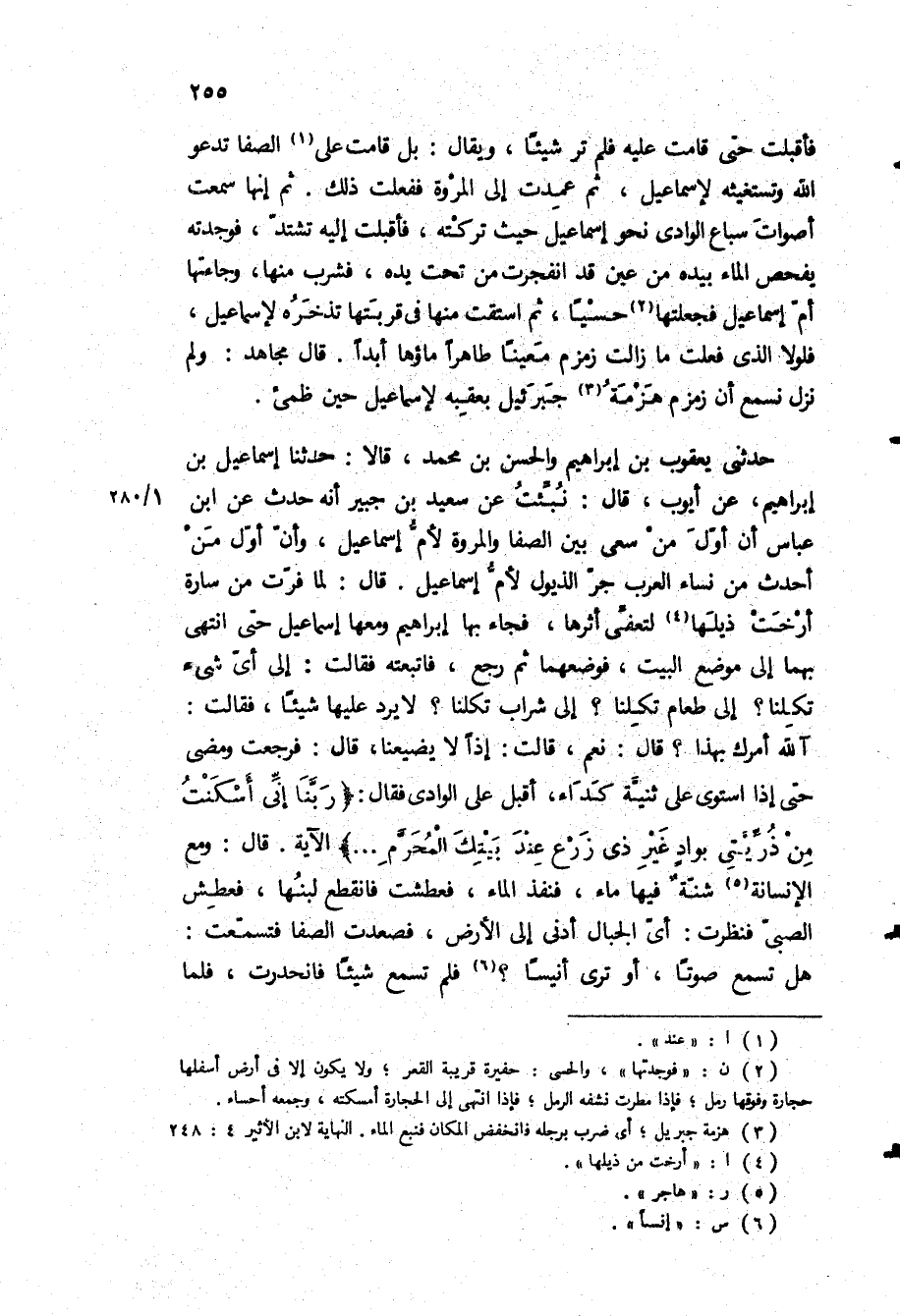 فأقبلت حتى قامت عليه فلم تر شيئا، ويقال: بل قامت على الصفا تدعو الله وتستغيثه لإسماعيل، ثم عمدت إلى المروة ففعلت ذلك ثم إنها سمعت أصوات سباع الوادي نحو إسماعيل حيث تركته، فأقبلت إليه تشتد، فوجدته يفحص الماء بيده من عين قد انفجرت من تحت يده، فشرب منها، وجاءتها أم إسماعيل فجعلتها حسيا، ثم استقت منها في قربتها تذخره لإسماعيل، فلولا الذي فعلت ما زالت زمزم معينا طاهرا ماؤها أبدا قال مجاهد: ولم نزل نسمع أن زمزم هزمه جبرئيل بعقبه لإسماعيل حين ظمئ حَدَّثَنِي يَعْقُوبُ بْنُ إِبْرَاهِيمَ وَالْحَسَنُ بْنُ مُحَمَّدٍ، قَالا: حَدَّثَنَا إِسْمَاعِيلُ بْنُ إِبْرَاهِيمَ، عَنْ أَيُّوبَ، قَالَ: نُبِّئْتُ عَنْ سَعِيدِ بْنِ جُبَيْرٍ أَنَّهُ حَدَّثَ عَنِ ابْنِ عَبَّاسٍ أَنَّ أَوَّلَ مَنْ سَعَى بَيْنَ الصَّفَا وَالْمَرْوَةِ لَأُمُّ إِسْمَاعِيلَ، وَأَنَّ أَوَّلَ مَنْ أَحْدَثَ مِنْ نِسَاءِ الْعَرَبِ جَرَّ الذُّيُولِ لَأُمُّ إِسْمَاعِيلَ قَالَ: لَمَّا فَرَّتْ مِنْ سَارَةَ أَرْخَتْ ذَيْلَهَا لِتُعْفِيَ أَثَرَهَا، فَجَاءَ بِهَا إِبْرَاهِيمُ وَمَعَهَا إِسْمَاعِيلُ حَتَّى انْتَهَى بِهِمَا إِلَى مَوْضِعِ الْبَيْتِ، فَوَضَعَهُمَا ثُمَّ رَجَعَ، فَاتَّبَعَتْهُ فَقَالَتْ: إِلَى أَيِّ شَيْءٍ تَكِلُنَا؟ إِلَى طَعَامٍ تَكِلُنَا؟ إِلَى شَرَابٍ تَكِلُنَا؟ لا يَرُدُّ عَلَيْهَا شَيْئًا، فَقَالَتْ: