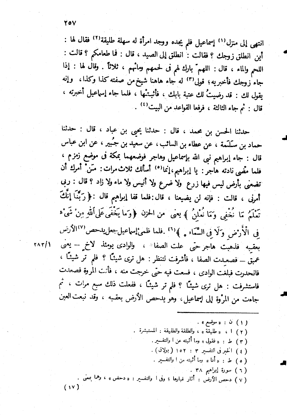 حَدَّثَنَا الْحَسَنُ بْنُ مُحَمَّدٍ، قَالَ: حَدَّثَنَا يَحْيَى بْنُ عَبَّادٍ، قَالَ: حَدَّثَنَا حَمَّادُ بْنُ سَلَمَةَ، عَنْ عَطَاءِ بن السائب، عَنْ سَعِيدِ بْنِ جُبَيْرٍ، عَنِ ابْنِ عَبَّاسٍ قَالَ: جَاءَ إِبْرَاهِيمُ نَبِيُّ اللَّهِ بِإِسْمَاعِيلَ وَهَاجَرَ فَوَضَعَهُمَا بِمَكَّةَ فِي مَوْضِعِ زَمْزَمَ، فلما مضى نادته هاجر: يا ابراهيم، انما أَسْأَلُكَ ثَلاثَ مَرَّاتٍ: مَنْ أَمَرَكَ أَنْ تَضَعَنِي بِأَرْضٍ لَيْسَ فِيهَا زَرْعٌ وَلا ضَرْعٌ وَلا أَنِيسٌ وَلا مَاءٌ وَلا زَادٌ؟ قَالَ: رَبِّي أَمَرَنِي، قَالَتْ: فَإِنَّهُ لَنْ يُضَيِّعَنَا، قَالَ: فَلَمَّا قَفَا إِبْرَاهِيمُ قَالَ: «رَبَّنا إِنَّكَ تَعْلَمُ مَا نُخْفِي وَما نُعْلِنُ» يَعْنِي مِنَ الْحُزْنِ «وَما يَخْفى عَلَى اللَّهِ مِنْ شَيْءٍ فِي الْأَرْضِ وَلا فِي السَّماءِ» فَلَمَّا ظَمِئَ إِسْمَاعِيلُ جَعَلَ يَدْحَصُ الأَرْضَ بِعَقِبِهِ فَذَهَبَتْ هَاجَرُ حَتَّى عَلَتِ الصَّفَا، وَالْوَادِي يَوْمَئِذٍ لأخ- يعنى عمبق- فَصَعِدَتِ الصَّفَا، فَأَشْرَفَتْ لِتَنْظُرَ: هَلْ تَرَى شَيْئًا؟ فَلَمْ تَرَ شَيْئًا، فَانْحَدَرَتْ فَبَلَغَتِ الْوَادِي، فَسَعَتْ فِيهِ حَتَّى خَرَجَتْ مِنْهُ، فَأَتَتِ الْمَرْوَةَ فَصَعِدَتْ فَاسْتَشْرَفَتْ: هَلْ تَرَى شَيْئًا؟ فَلَمْ تَرَ شَيْئًا، فَفَعَلَتْ ذَلِكَ سَبْعَ مَرَّاتٍ، ثُمَّ جَاءَتْ مِنَ الْمَرْوَةِ إِلَى إِسْمَاعِيلَ، وَهُوَ يَدْحَصُ الأَرْضَ بِعَقِبِهِ، وَقَدْ نَبَعَتِ الْعَيْنُ